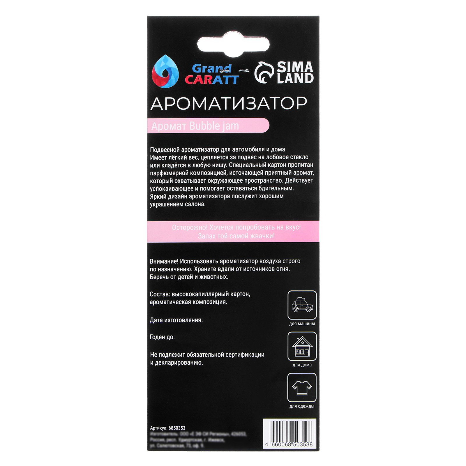 Ароматизатор для машины Бабл Гам, подвесной, картонный, Grand Caratt, Россия