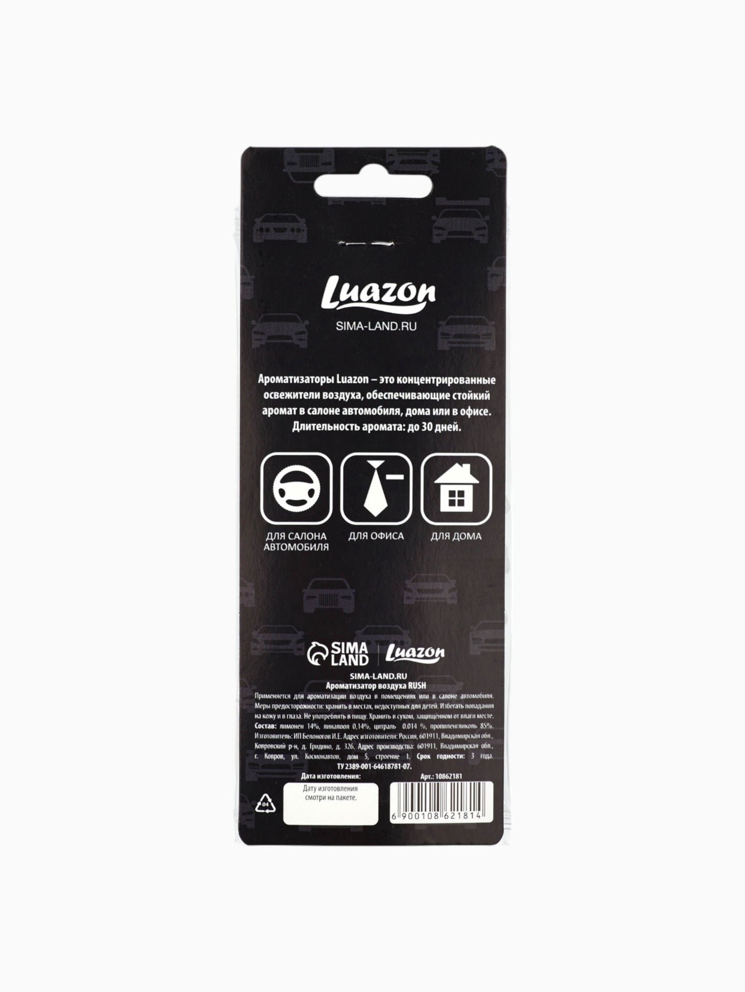 Вид ароматизатора: Бумажный, Подвесной Размер упаковки: 8 x 16.5 x 0.3 см. Аромат: Чёрный лёд tnved: 3307490000 | ||