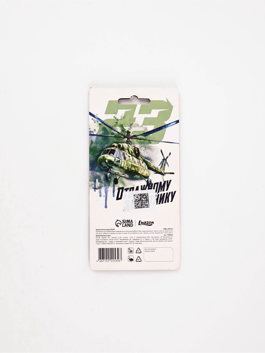 Размер упаковки: 8 x 16.5 x 0.5 см. tnved: 3307490000 Для кого: Для мужчины Тематика праздника: 23 Февраля Вид ароматизатора: Бумажный Аромат: Чёрный лёд Набор: Нет | ||