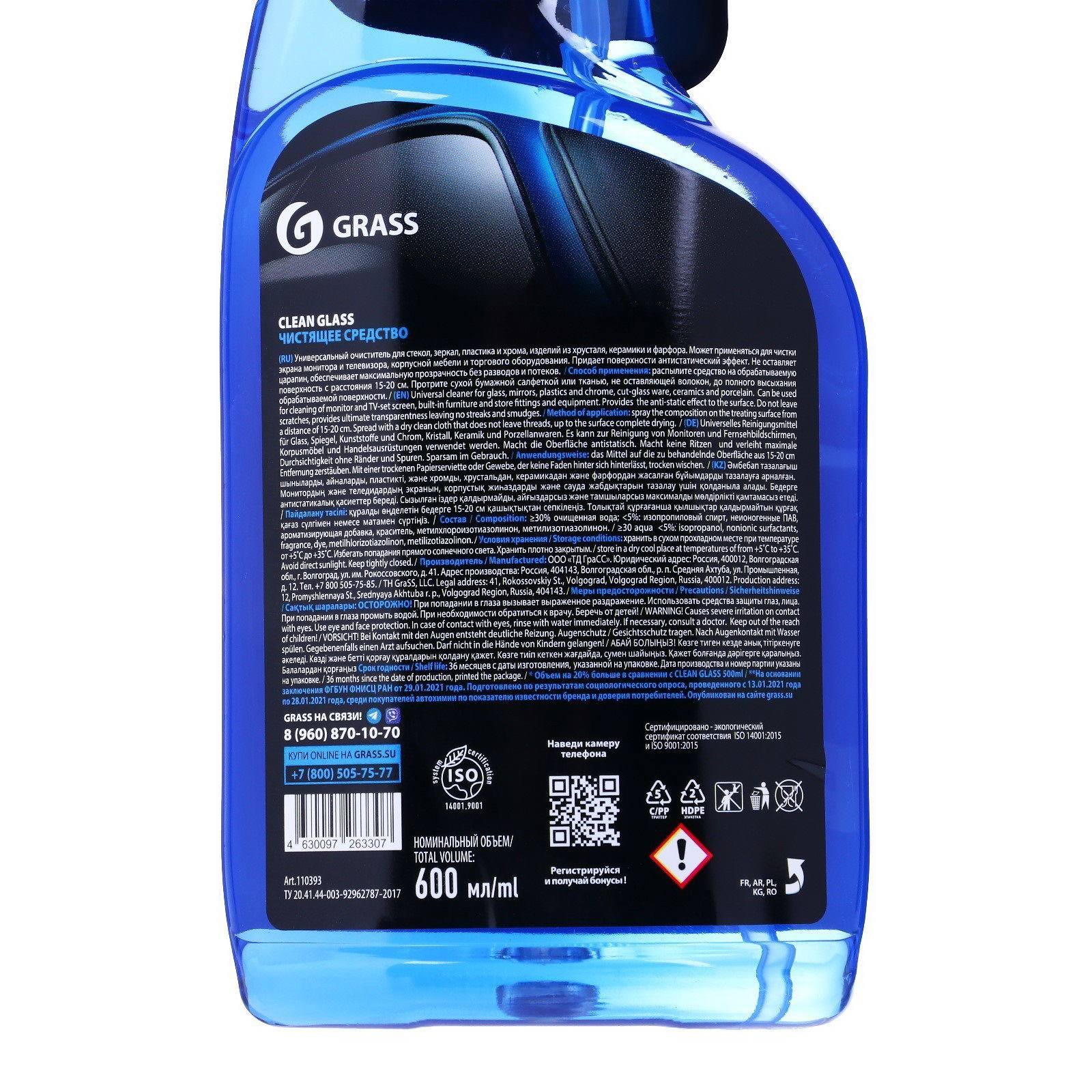 Очиститель стекол Clean Glass, 600 мл, триггер, 600 мл., GRASS, Россия