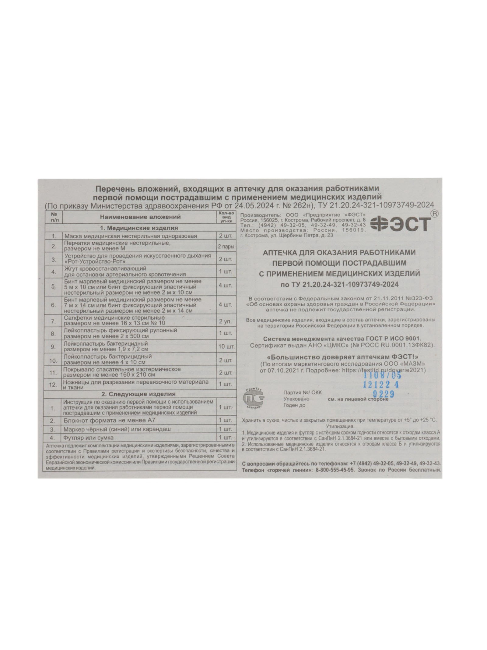 Аптечка для оказания первой помощи работникам "ФЭСТ", футляр №2, приказ 262н, 22x22x8 см., Фэст, Россия