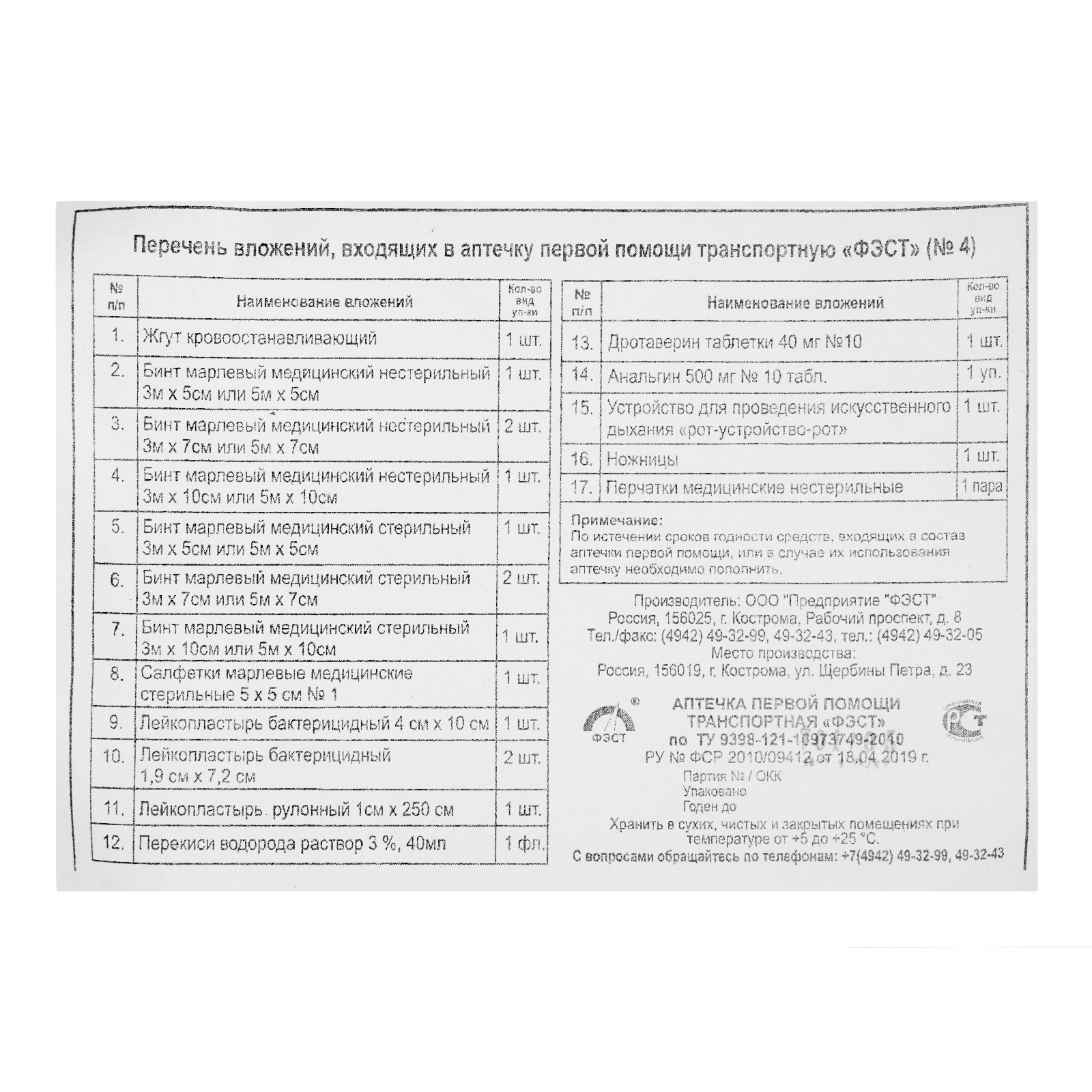 Автомобильная аптечка первой помощи "ФЭСТ", дорожная, перечень №4, мягкий футляр, Фэст, Россия