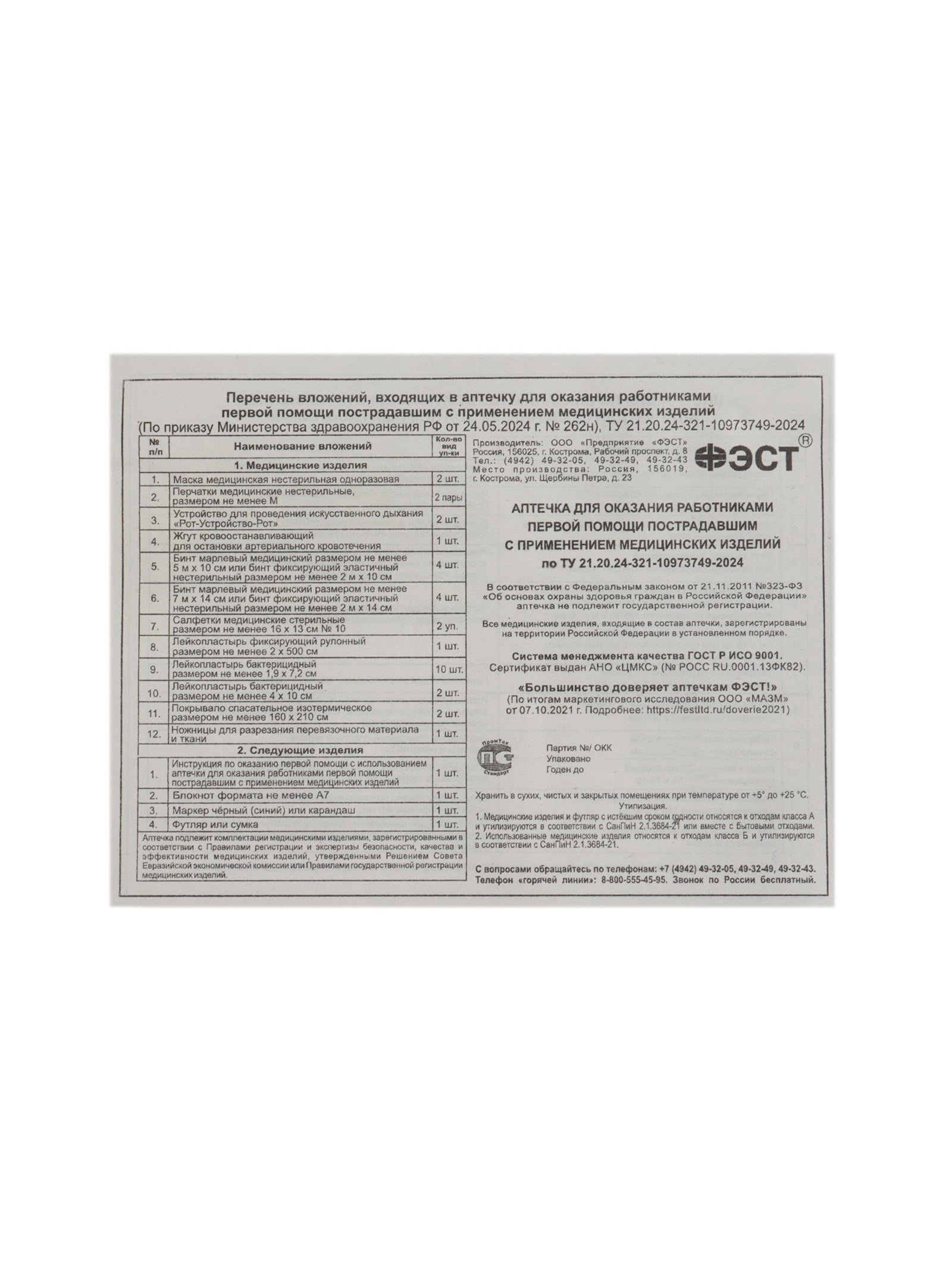 Аптечка для оказания первой помощи работникам ФЭСТ, сумка 0370/1, приказ а 262н, Фэст, Россия