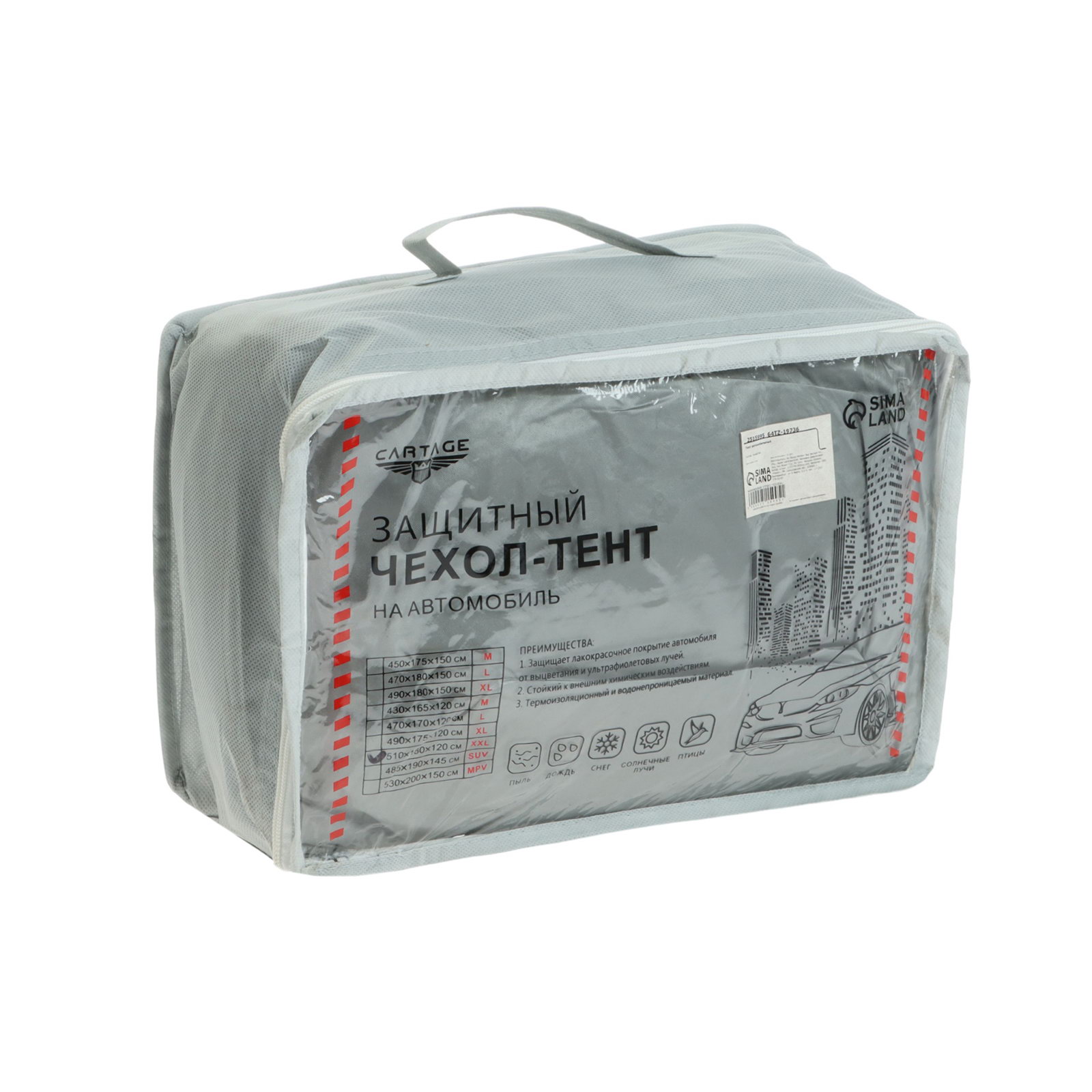 Размер упаковки: 26 x 6 x 38 см. tnved: 6307909600 Назначение: Легковой автомобиль Вид: Тент Цвет: Белый Размер: 2XL см Автомобильный тент от фирмы CARTAGE - идеальное решение для защиты вашего автомобиля от неблагоприятных погодных условий и внешних воздействий. Изготовленный из высококачественного водонепроницаемого полиэстера, он обеспечивает надежную защиту от дождя, снега, пыли, ультрафиолетовых лучей и посторонних взглядов. Размеры тента 510x180x120 см позволяют закрыть большинство автомобилей, включая крупные внедорожники и грузовики. Легкий в установке и компактный в хранении, этот тент обеспечит вашему автомобилю долговечную защиту от внешних воздействий, сохраняя его в отличном состоянии. Автомобильный тент от CARTAGE - идеальный выбор для тех, кто ценит свое транспортное средство и хочет продлить его срок службы. | ||