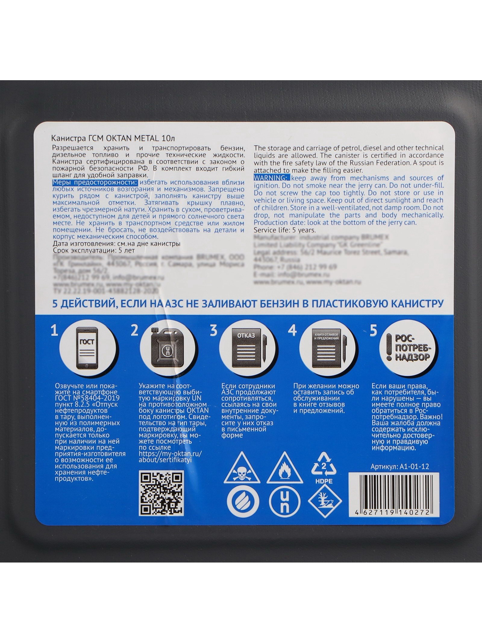 Канистра ГСМ METAL, 10 л, пластиковая, серая, Oktan, Россия