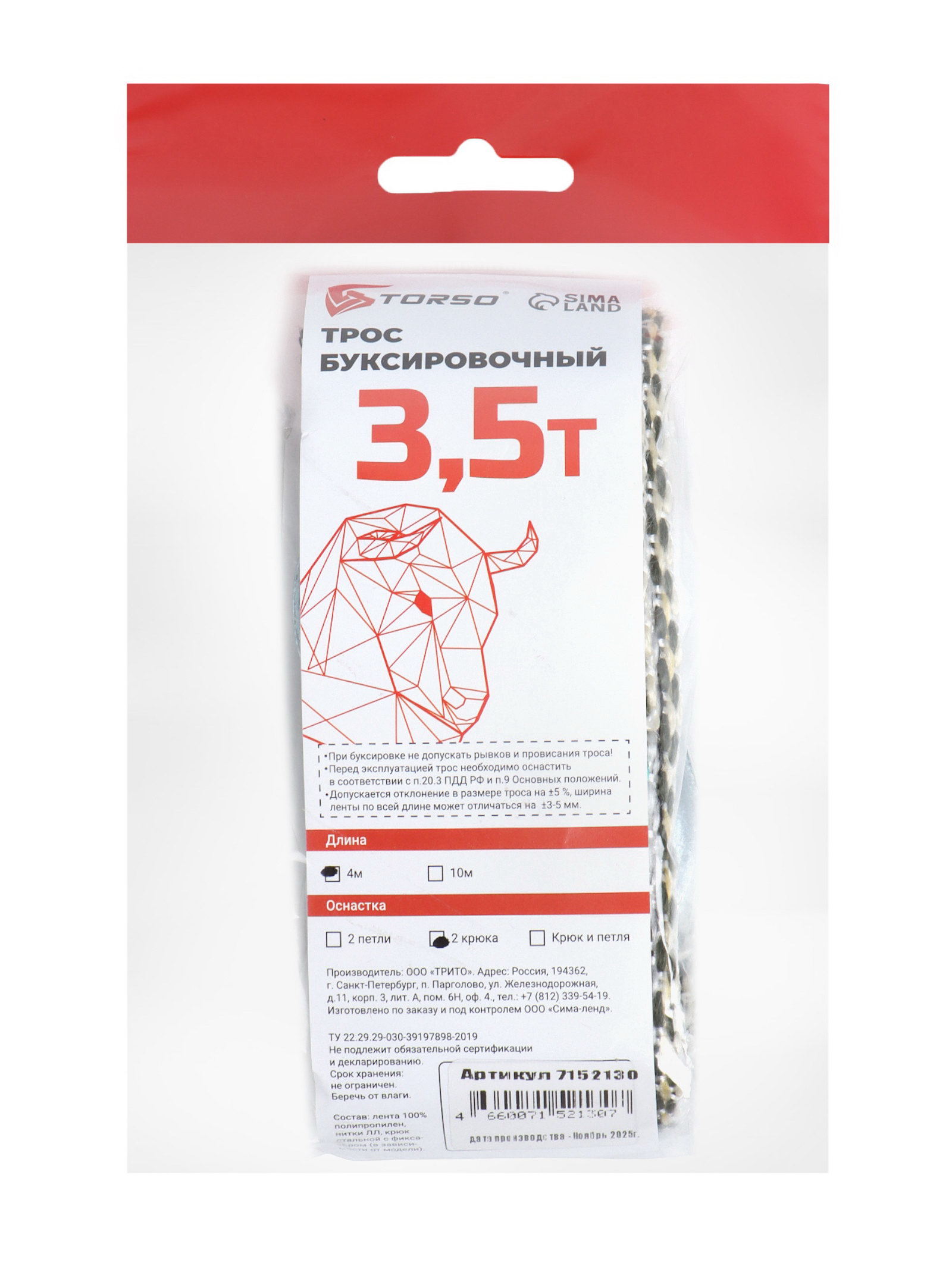Трос-лента буксировочный 3.5 т, 4 м, 2 крюка, TORSO, Россия