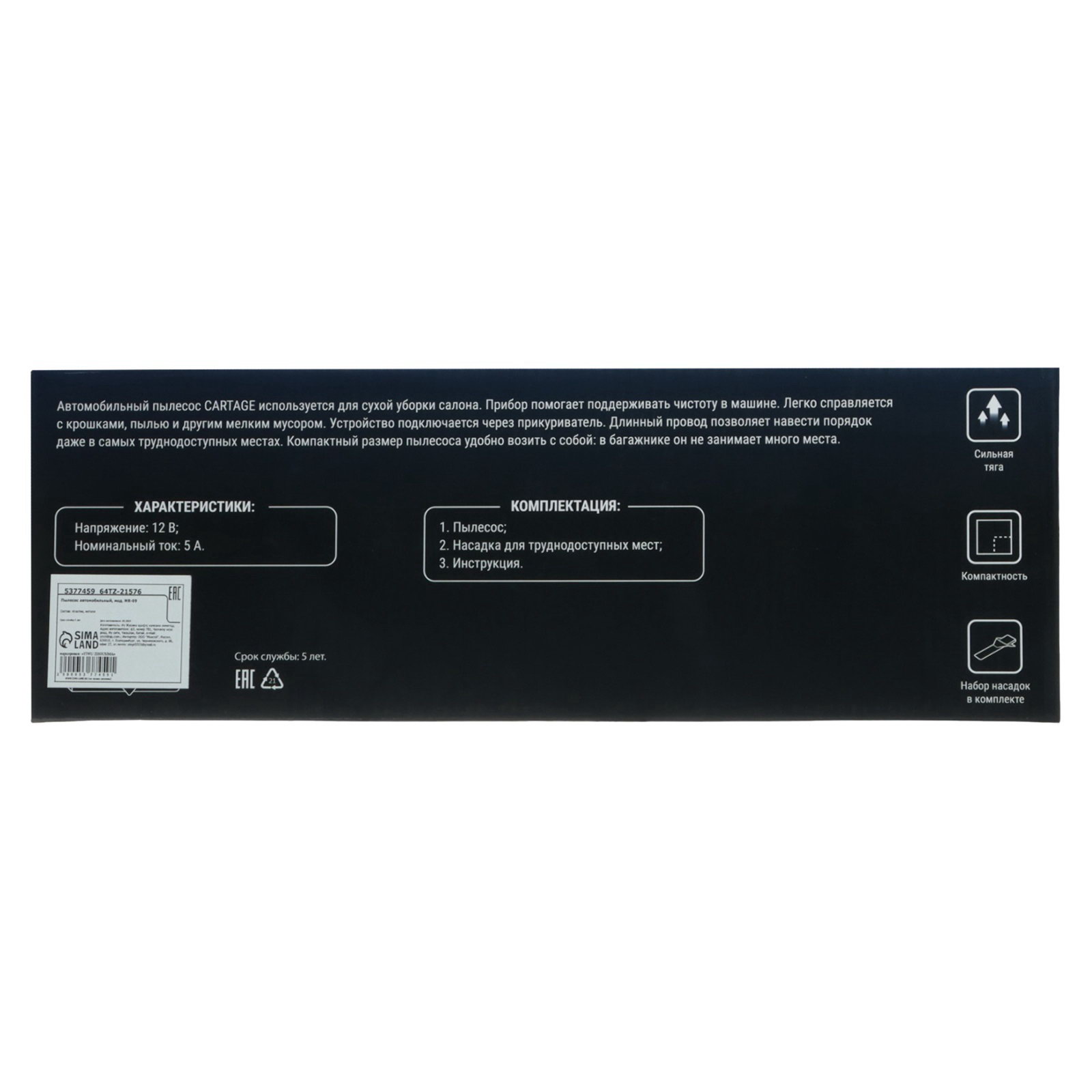 Размер упаковки: 10 x 13 x 36.5 см. tnved: 8508110000 tnved: 8508110000 Мощность, Вт: 130 Цвет: Чёрный Вид пылесоса: Ручной Напряжение, В: 12 Беспроводной: Да Потребляемая мощность, Вт: 130 Мощность всасывания, Вт: 130 Объём пылесборника, л: 0.3 Количество насадок: 5 Регулировка мощности: Нет Вид трубы пылесоса: Цельная Тип питания: 12 В Тип уборки: Сухая Насадка в комплекте: Щелевая Ручной: Да Тип пылесборника: Контейнер Время непрерывной работы, мин: 20 Длина шнура, м: 1 Расположение пылесборника/мотора: Сверху Вид фильтра: Циклон Управление со смартфона: Нет Стильный и функциональный беспроводной пылесос станет незаменимым помощником для каждого автолюбителя, заботящегося о чистоте салона. Благодаря высокой мощности и автономной работе он обеспечивает эффективную уборку без ограничений по перемещению и необходимости подключать устройство к прикуривателю или розетке. Устройство отличается прочной сборкой, элегантным чёрным корпусом и продуманной эргономикой такой аксессуар всегда приятно держать в руках и удобно использовать даже в долгих поездках. Ключевые преимущества: