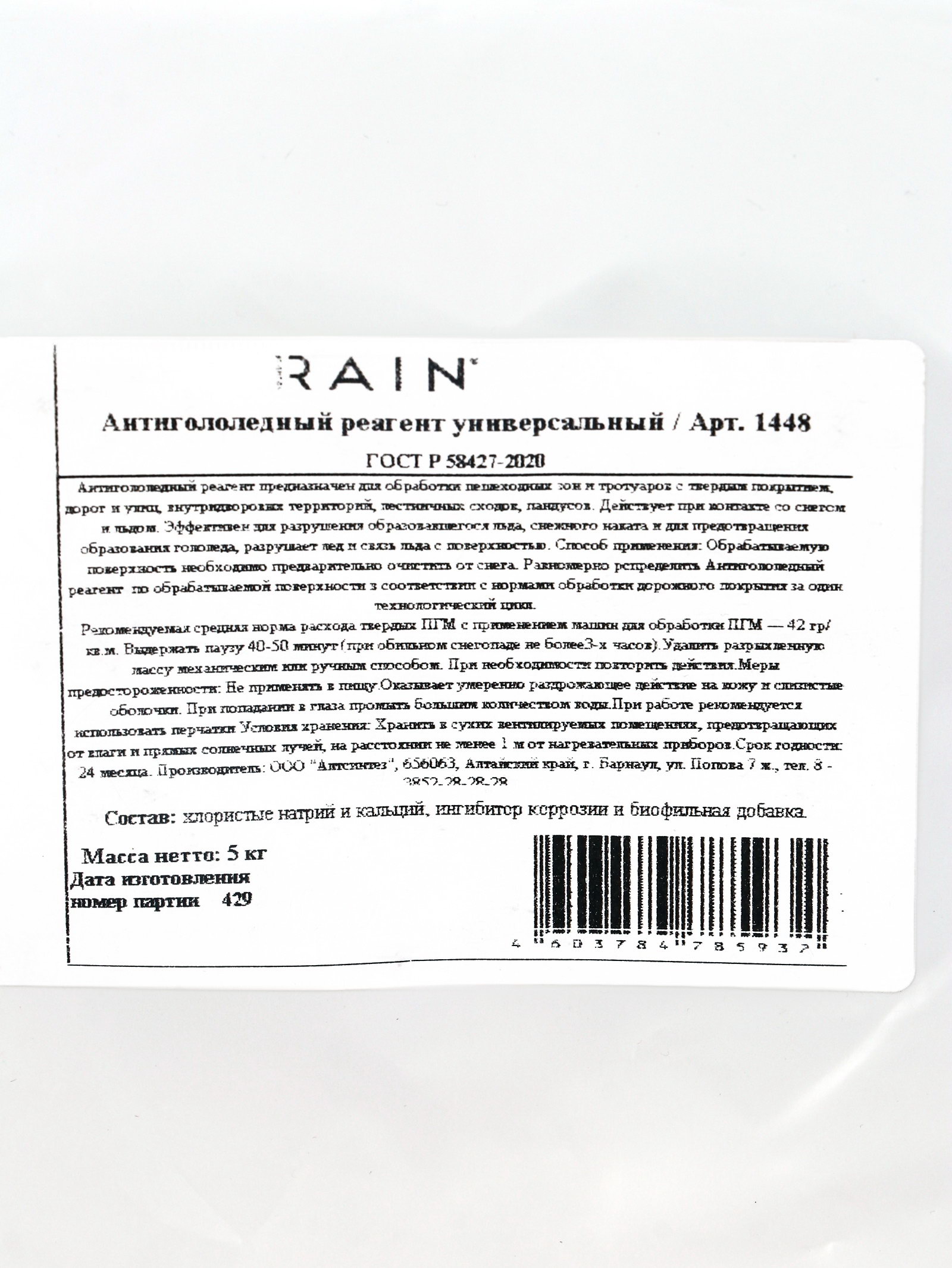 Антигололедный реагент универсальный, 5 кг, Sound of Rain, Россия