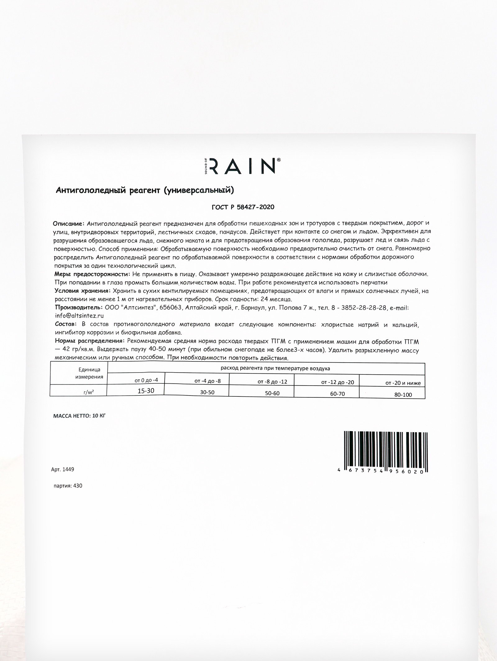 Антигололедный реагент универсальный, 10 кг, Sound of Rain, Россия