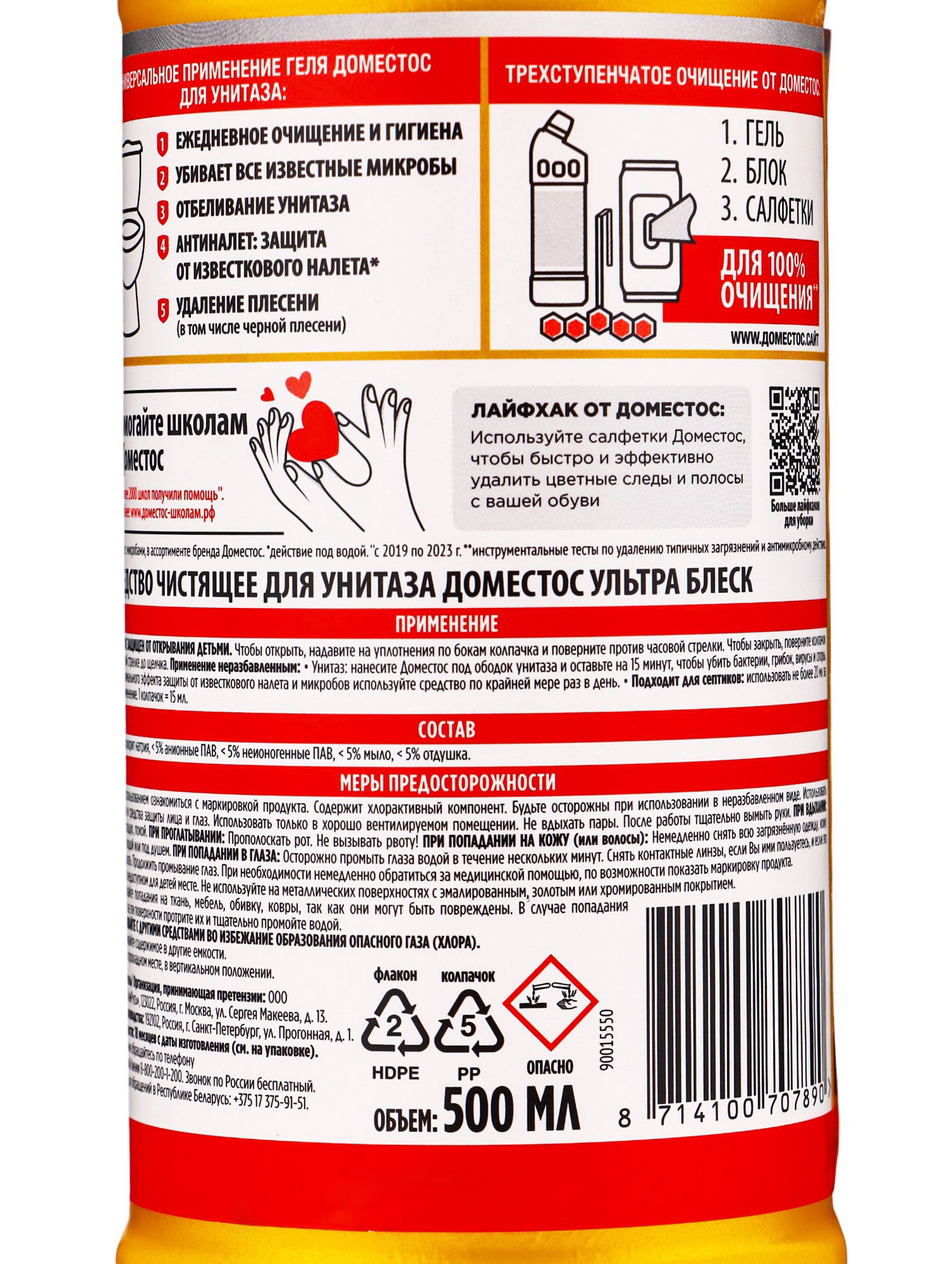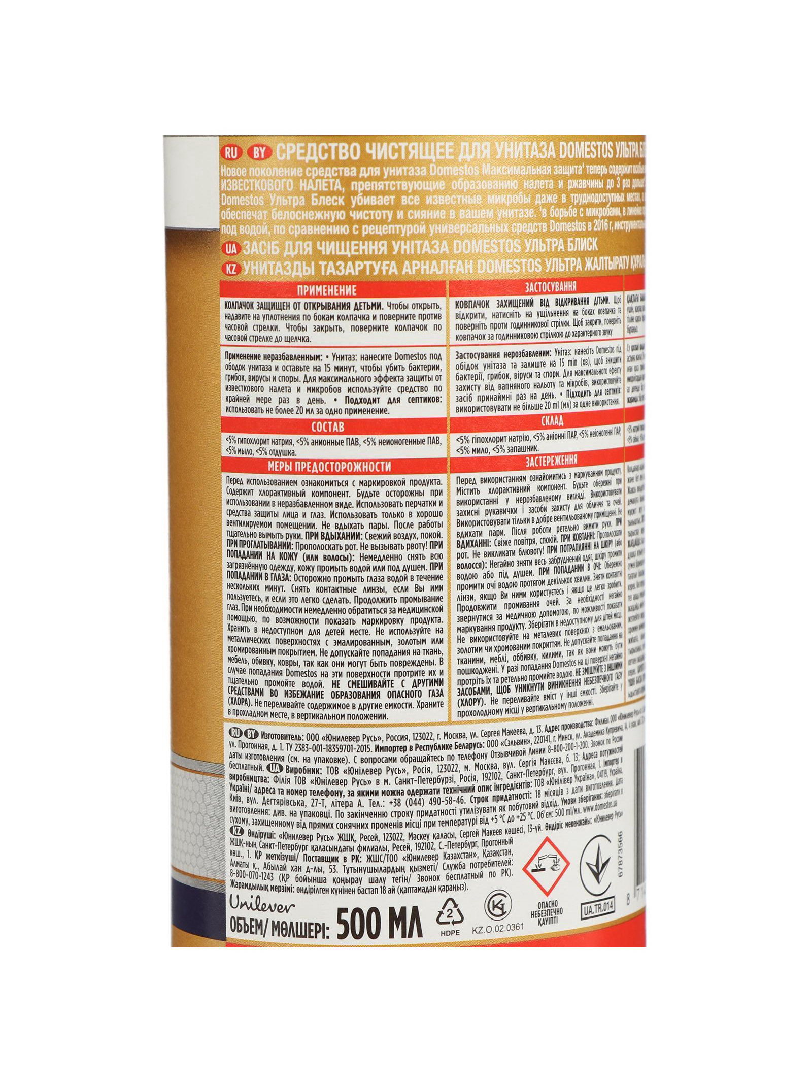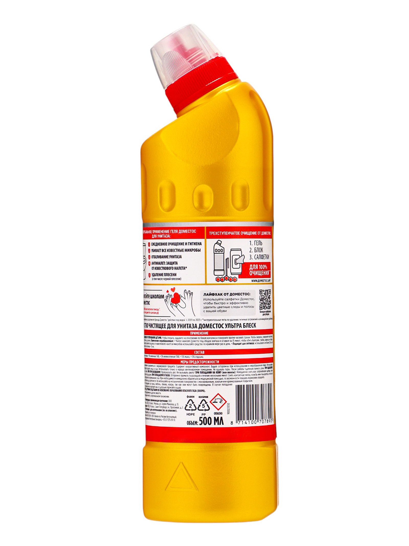 Чистящее средство Domestos "Ультра блеск", гель, для унитаза, 500 мл, 7.1x5.3x25.9 см., Доместос, Россия