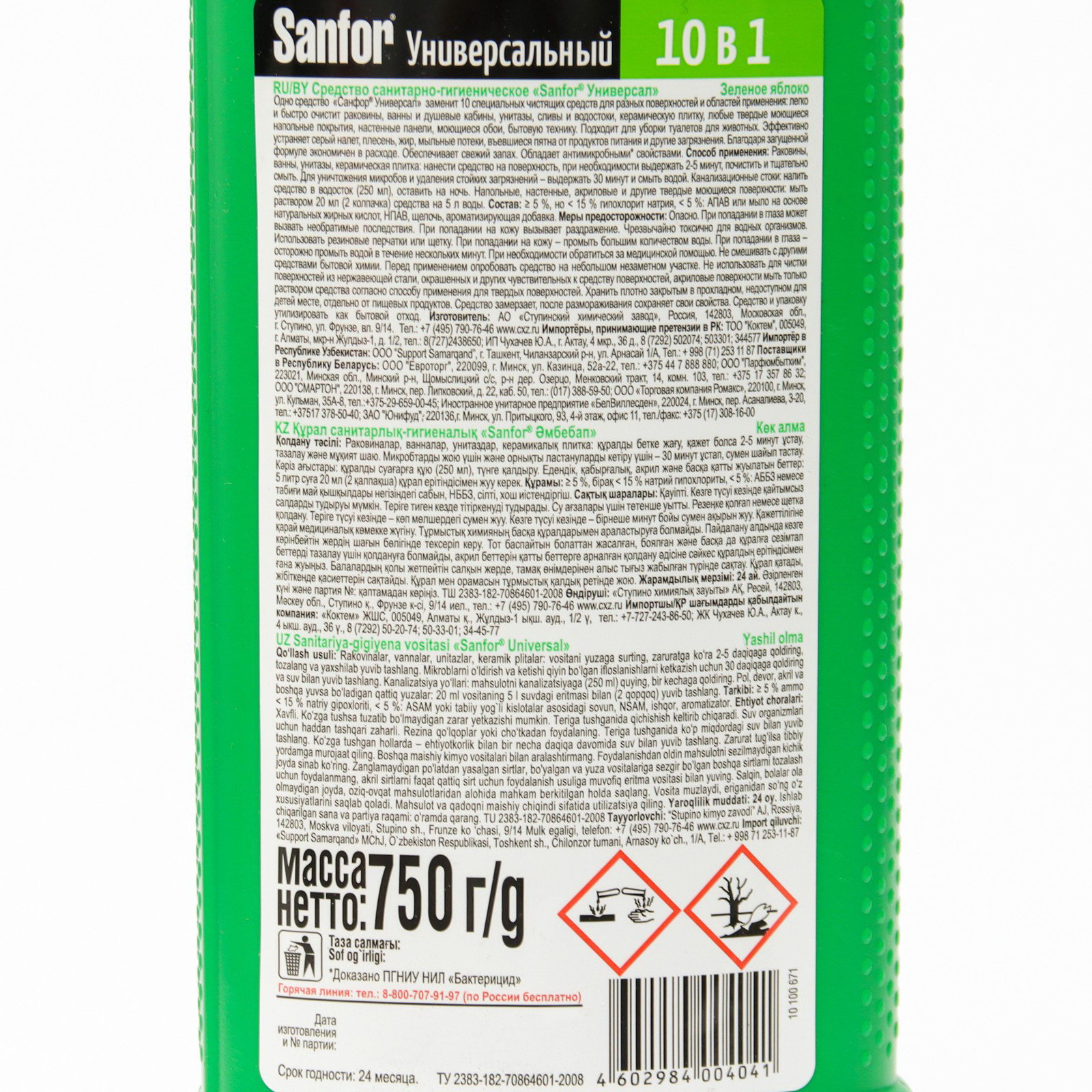 Чистящее средство "Зеленое яблоко", антимикробный, гель, универсальное, 750 мл, Sanfor, Россия