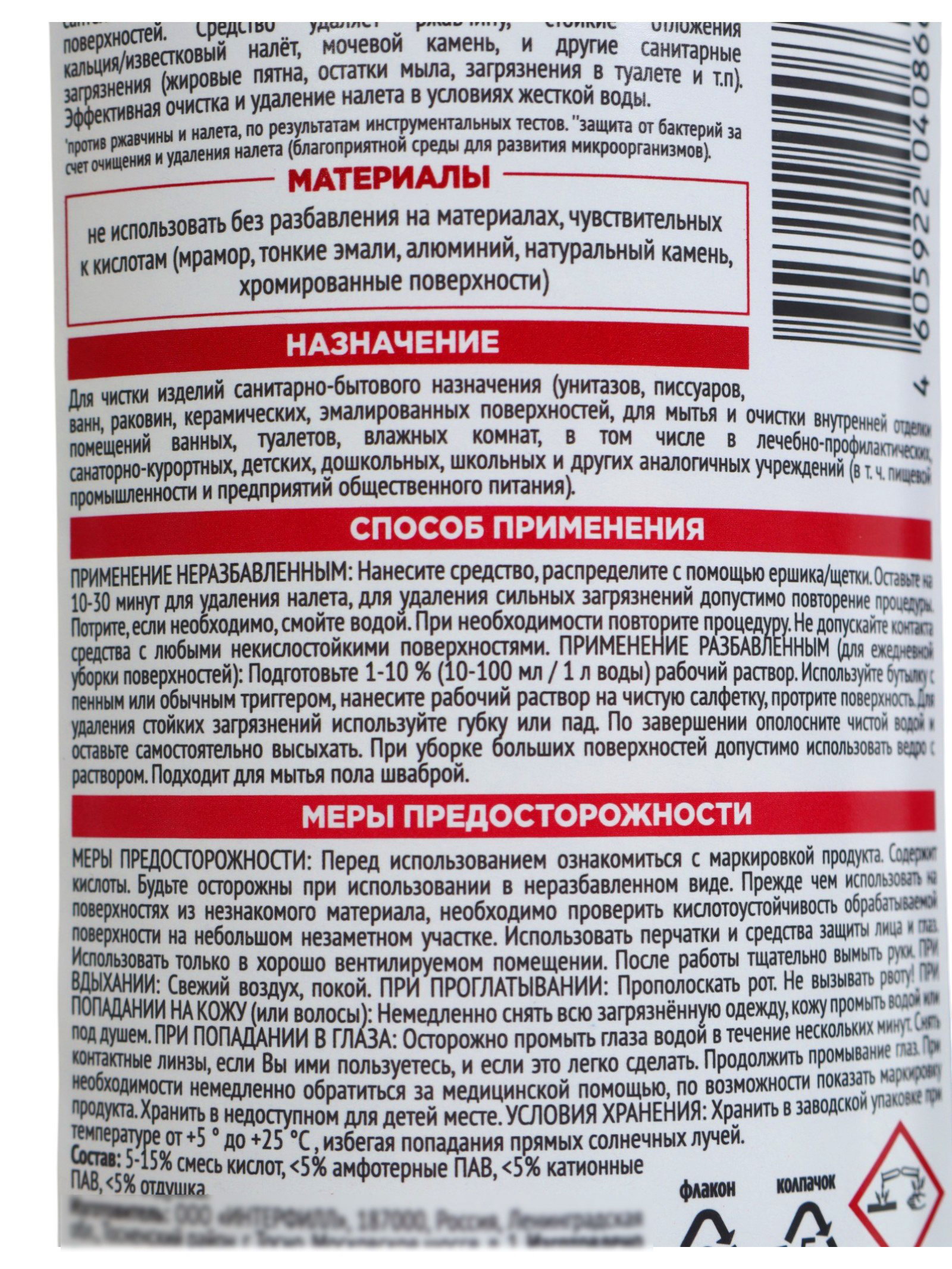 Меры предосторожности:Использовать только на кислотостойких поверхностях. Не смешивать с хлорсодержащими средствами. Избегать попадания на кожу и в глаза. Работать в перчатках и в проветриваемом помещении. При попадании немедленно промыть большим количеством воды. Хранить в недоступном для детей месте. Средство Domestos сильнокислотное это эффективное решение для профессионального удаления сложных минеральных отложений и поддержания идеальной чистоты сантехники. | ||