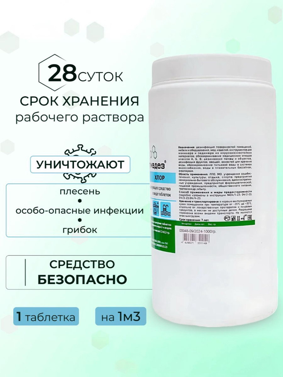 Размер упаковки: 10 x 18.5 x 10 см. tnved: 3808948000 Температурное ограничение: Нет Назначение: Бытовые Вид: Хлоросодержащиее Вес, г/Объём, мл: 1000 Форма выпуска: Таблетки Запрет реализации по сегментам: 00000000208 Средство выпускается в виде таблеток белого цвета, цилиндрической формы массой 3,4 либо 1,7 грамма, а также в виде гранул. Состав: в качестве действующего вещества средство содержит натриевую соль дихлоризоциануровой кислоты (дихлоризоцианурат натрия). Действующим веществом является активный хлор, выделяющийся при взаимодействии средства с водой. При растворении в воде одной таблетки массой 3,4 грамма выделяется не менее 1,5 г активного хлора. Этого количества достаточно для приготовления 10 литров рабочего раствора, применяемого для дезинфекции поверхностей при обычных условиях (бактериальный режим).Гранулы мелкие сыпучие белого цвета с запахом хлора. Для приготовления из гранул 10 литров рабочего раствора, применяемого для дезинфекции поверхностей при обычных условиях (по бактериальному режиму) необходимо взять 2,7 г гранул (в комплекте идет мерная ложечка). Антимикробная активность в отношении всех видов микроорганизмов:
