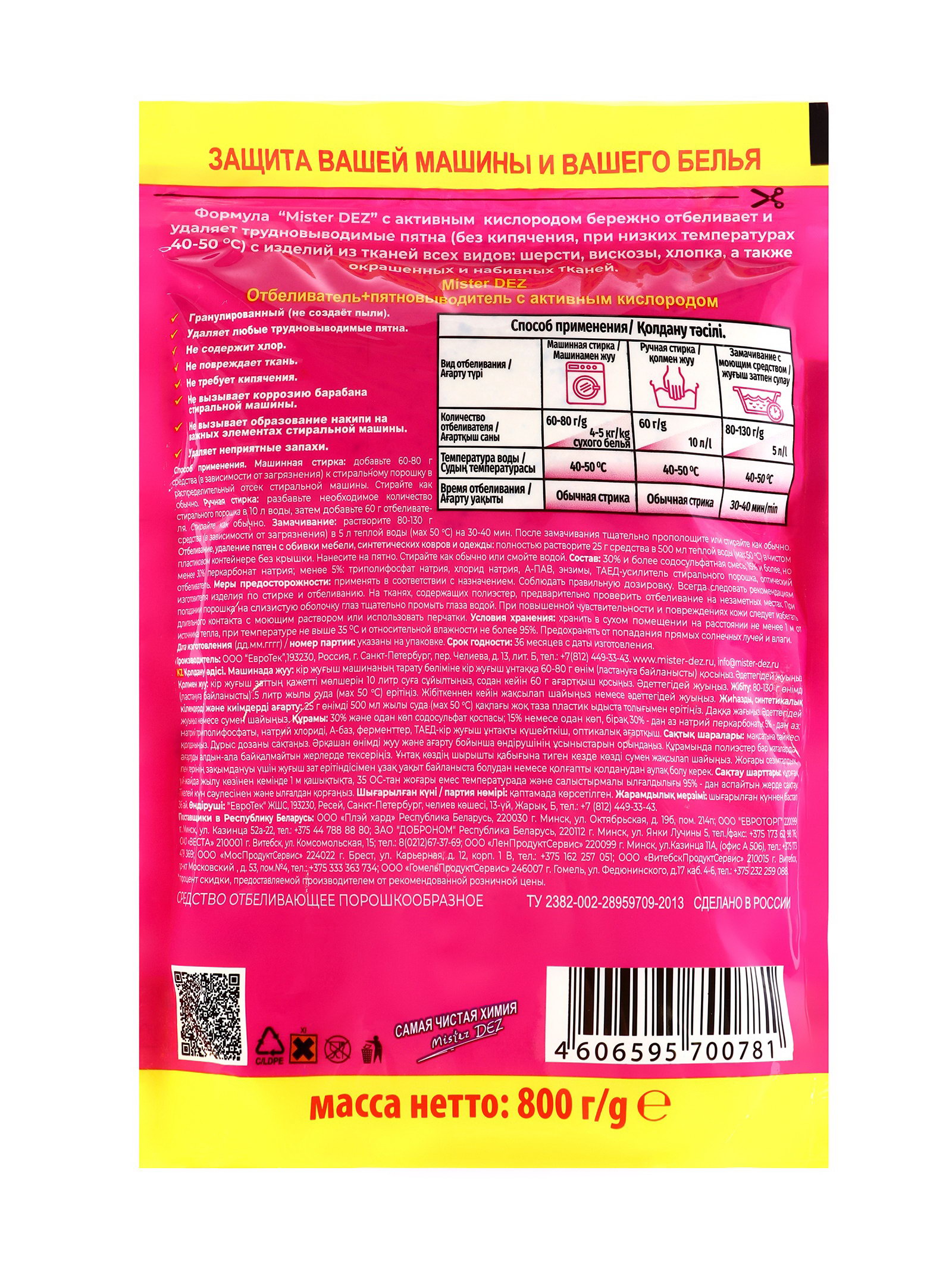 Отбеливатель порошок, для тканей, кислородный, 800 г, 2x13.5x22.5 см., Mister DEZ, Россия