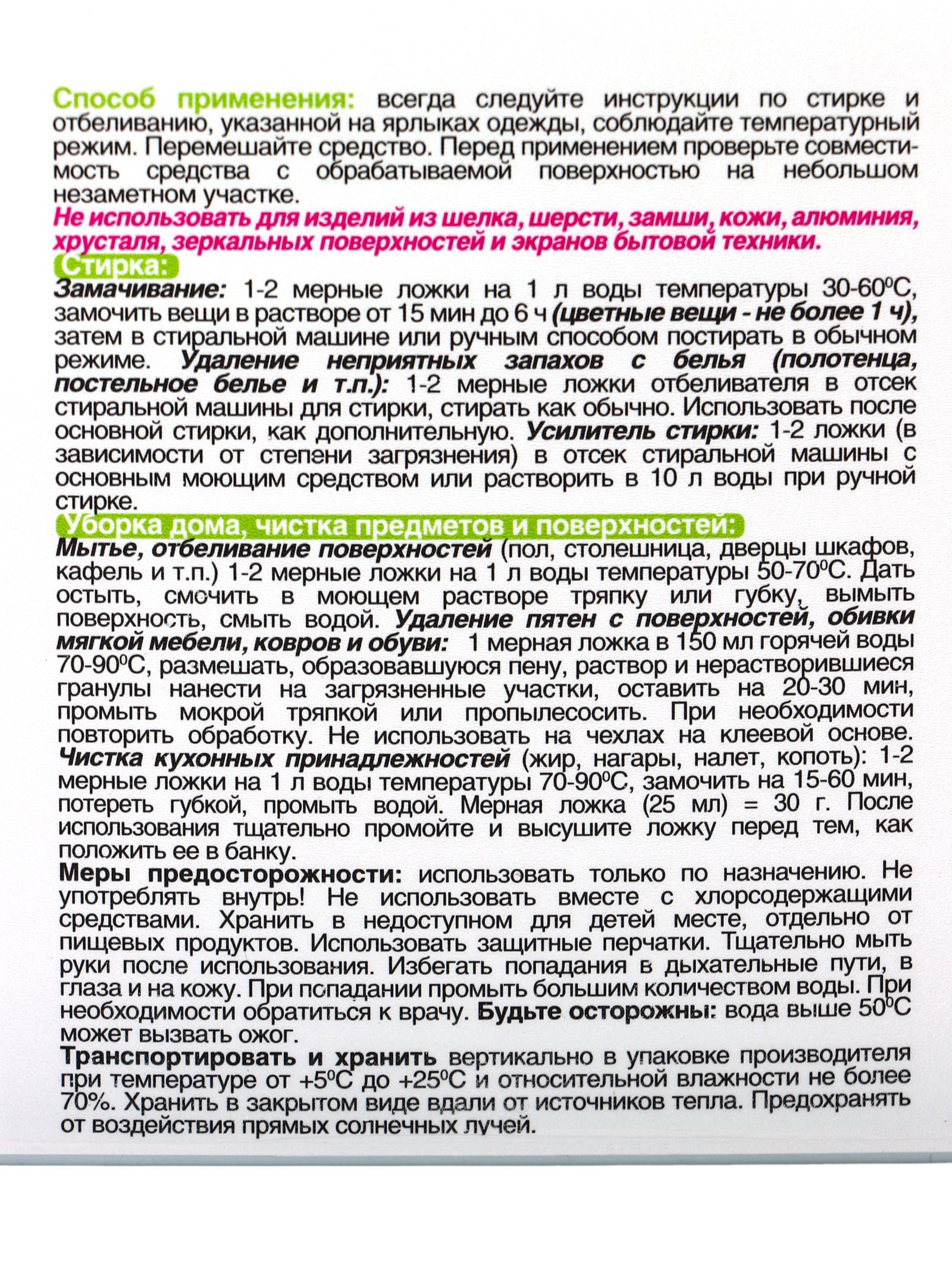 Размер упаковки: 13 x 10.5 x 13 см. Назначение: Для всех видов тканей Вес, г/Объём, мл: 1000 tnved: 3402209000 tnved: 3402209000 tnved: 3402209000 Запрет реализации по сегментам: 00000000208 Форма выпуска: Порошок Отбеливатель пятновыводитель эффективно удаляет загрязнения с различных тканей. Входящие в его состав особые компоненты глубоко проникают в любые бытовые пятна и выводят их. Пенящееся средство устраняет неприятные запахи и дарит свежесть, не разрушает и не портит ткань. При стирке используйте резиновые перчатки. Не допускайте контакта с глазами, кожей и одеждой. При попадании пятновыводителя в глаза промойте их большим количеством воды и обратитесь к врачу, показав этикетку средства. При наличии контактных линз немедленно удалите их и продолжайте промывать глаза. | ||