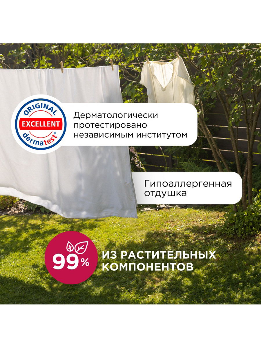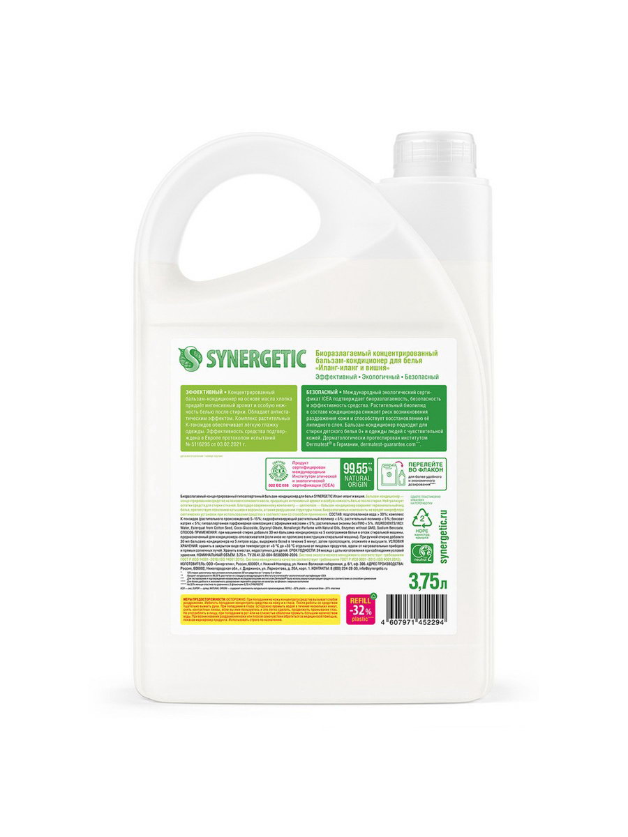 Размер упаковки: 11 x 29.5 x 18 см. Размер упаковки: 11 x 29.5 x 18 см. tnved: 3402500000 Температурное ограничение: Нет Запрет реализации по сегментам: 00000000208 Особенности средства: Концентрат Назначение: Для белых тканей Аромат: МИКС Биоразлагаемый концентрированный гипоаллергенный бальзам-кондиционер для белья SYNERGETIC с нежным ароматом "Иланг-иланг и вишня" на основе масла хлопка придает белью мягкость и способствует его быстрому высыханию после стирки. Средство нейтрализует остатки средств для стирки на ткани, помогает сохранить структуру ткани, защищая волокна от изнашивания и повреждения. Подходит для ручной и машинной стирки, для всех типов ткани, в том числе деликатных, таких как шерсть и шелк. Средство обладает антистатическим эффектом, а содержащийся в нем комплекс растительных К-тензидов обеспечивает легкую глажку одежды. Благодаря современному инновационному компоненту - целлюлазе - бальзам-кондиционер помогает сохранить первоначальный вид белья, препятствует появлению катышков и ворсинок, а также разрушению структуры ткани, возвращая яркость цветам и гладкость волокнам. Растительный биолипид в составе кондиционера снижает риск возникновения раздражения кожи и способствует восстановлению ее липидного слоя. Бальзам-кондиционер подходит для стирки детского белья 0+ и одежды людей с чувствительной кожей. При стирке добавить 30 мл кондиционера на пять килограммов белья. Беречь от детей. При попадании средства в глаза промыть водой. Использовать строго по назначению. Состав:Подготовленная вода > 30%; комплекс растительных А-тензидов (ПАВ из растительного масла) 5–15%; комплекс растительных Н-тензидов (ПАВ из растительного масла) 5–15%; цитрат натрия < 5%; зелёный хелат < 5%; функциональные добавки < 5%; гипоаллергенная парфюмерная композиция с эфирными маслами лаванды, бергамота, шалфея. | ||