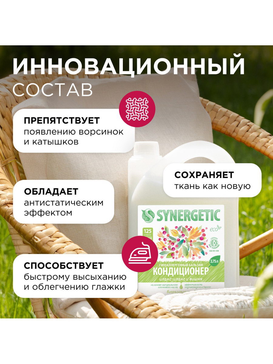 Бальзам-кондиционер для белья "Иланг-иланг и вишня", концентрат, 3.75 л, 3750 мл., Synergetic, Россия