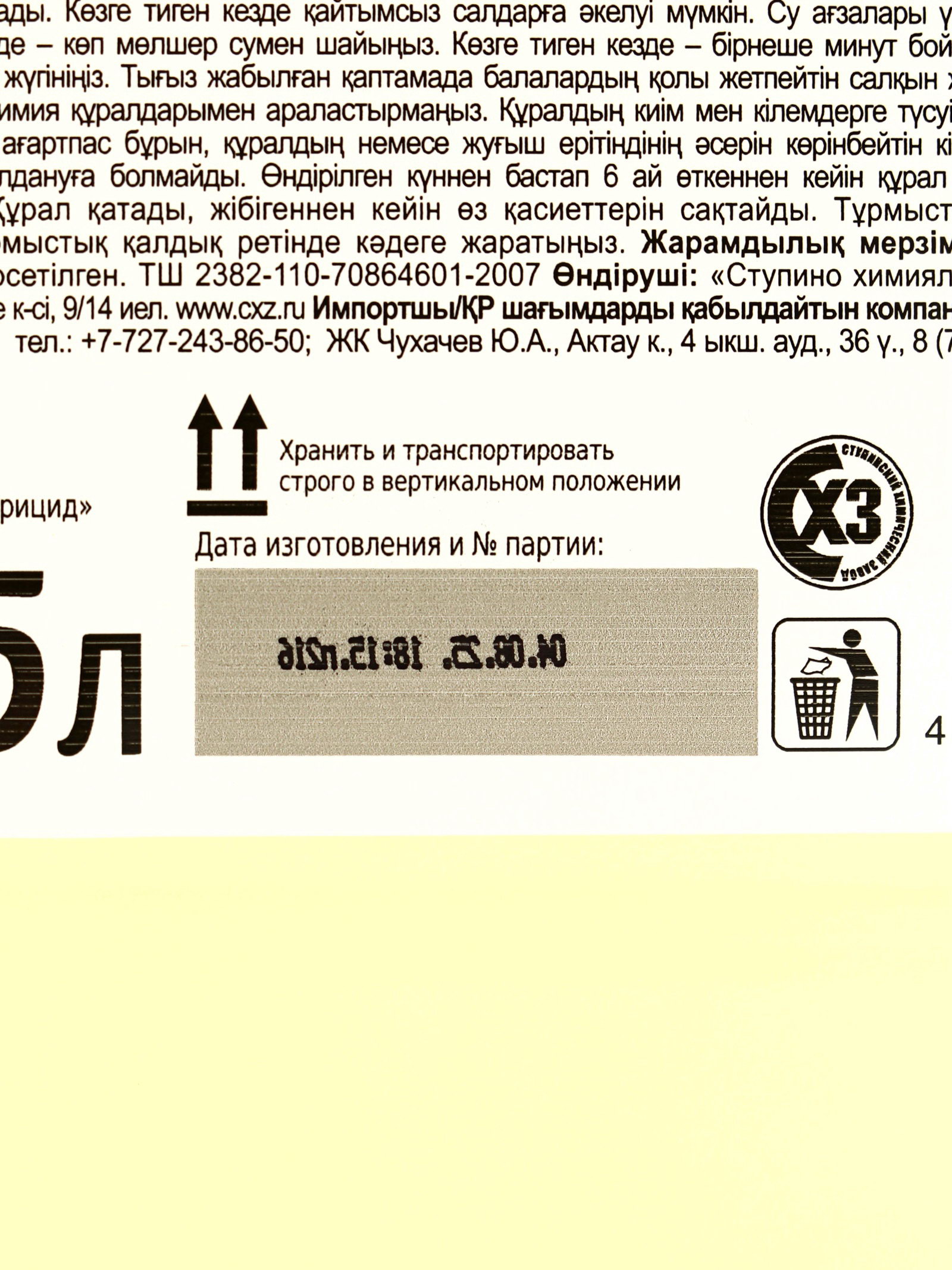 Назначение: Бытовые, Профессиональные Размер упаковки: 14 x 23.5 x 18.5 см. Размер упаковки: 14 x 23.5 x 18.5 см. tnved: 3402909000 Температурное ограничение: Нет Вид: Щелочное Вес, г/Объём, мл: 5000 Форма выпуска: Жидкость Запрет реализации по сегментам: 00000000208 Средство для отбеливания, чистки и дезинфекции Sanfor Белизна Гель 3 в 1 Назначение Средство предназначено для чистки и дезинфекции сантехники и труб, а также для замачивания белья перед стиркой и отбеливания. Способ применения: замачивание перед стиркой (белье с общим загрязнением): приготовить раствор - 20 г (2 колпачка) средства на 10 л холодной воды. Замочить на 10 минут, прополоскать. Далее стирать как обычно. - Отбеливание (наличие стойких пятен): приготовить раствор - 20 г (2 колпачка) средства на 10 л теплой (30°C-35°C) воды. Выдержать 40 минут, прополоскать. Далее стирать как обычно. Не использовать для шерсти и шелка, а также для непрочно окрашенных тканей. Ванны, раковины, унитазы, керамическая плитка: нанести средство на поверхность, через 5 минут смыть. Для чистки стоков, уничтожения бактерий, удаления загрязнений и пятен выдержать 60 минут, смыть водой. Пол, кафель, пластик, эмалированные поверхности: мыть раствором - 20 г (2 колпачка) средства на 5 л воды. Промыть поверхность водой. Меры предосторожности: при работе использовать резиновые перчатки. При попадании средства в глаза или на кожу промыть большим количеством воды, при необходимости обратиться к врачу. Хранить в недоступном для детей месте. Хранить в сухом прохладном месте в вертикальном положении. Предохранять от попадания прямых солнечных лучей. Срок годности 18 месяцев с даты изготовления. Состав: гипохлорит натрия >5%, но <15%, анионные ПАВ или мыло на основе натуральных жирных кислот <5%, неионогенные ПАВ, щелочь, ароматизатор. | ||