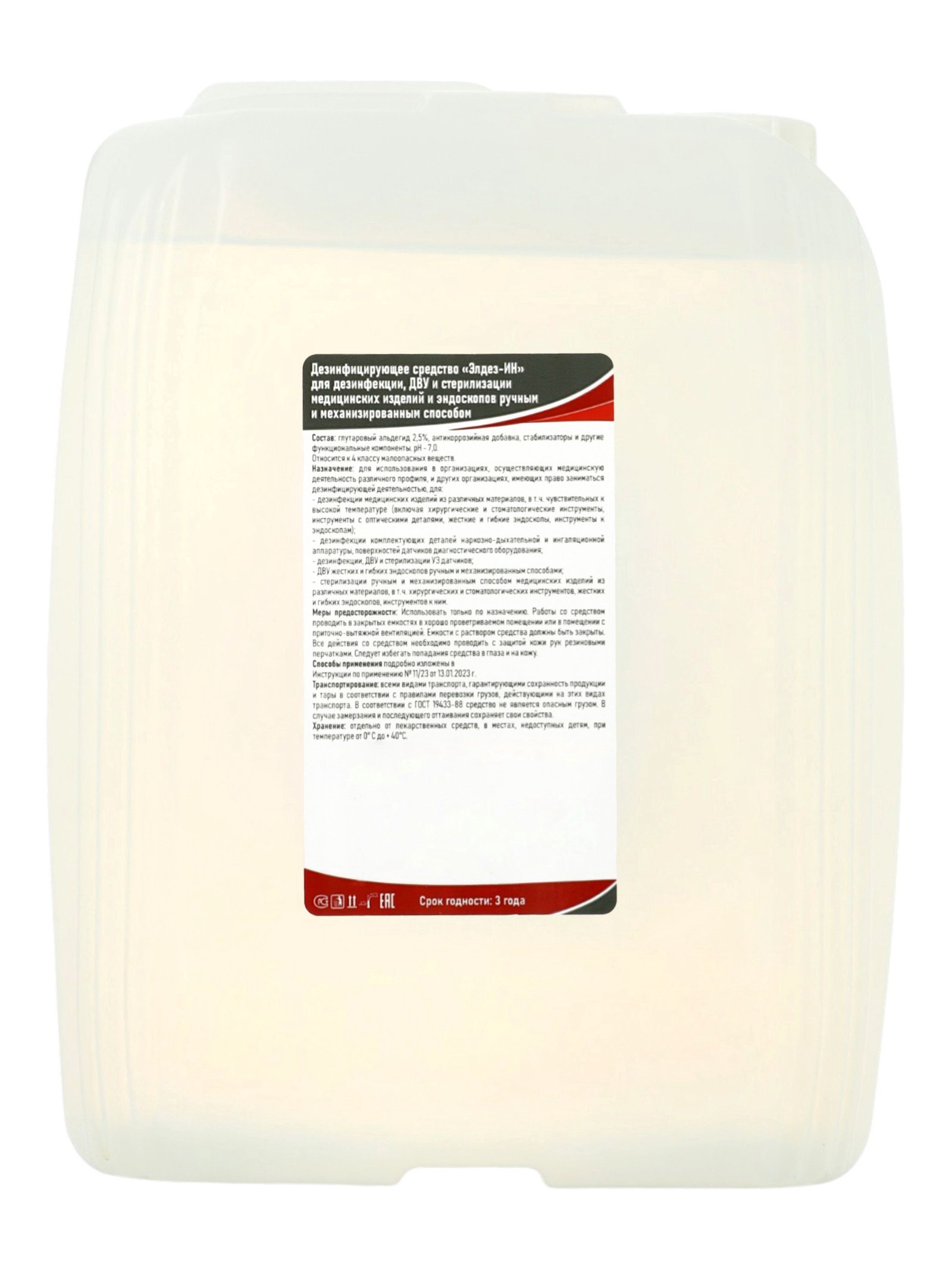 Размер упаковки: 14.5 x 25 x 18.5 см. tnved: 3808948000 Температурное ограничение: Нет Запрет реализации по сегментам: 00000000208 Форма выпуска: Жидкость Назначение: Профессиональные Вес, г/Объём, мл: 5000 Вид: Альдегидные Элдез-ИН 5 л профессиональное дезинфицирующее средство в экономичной канистре, предназначенное для глубокой дезинфекции и стерилизации инструментов и оборудования. Представляет собой готовую к применению прозрачную жидкость со слабым специфическим запахом. Основу состава составляет глутаровый альдегид (около 2,5%), обеспечивающий высокую антимикробную активность и широкий спектр действия. Описание и свойстваСредство эффективно уничтожает: