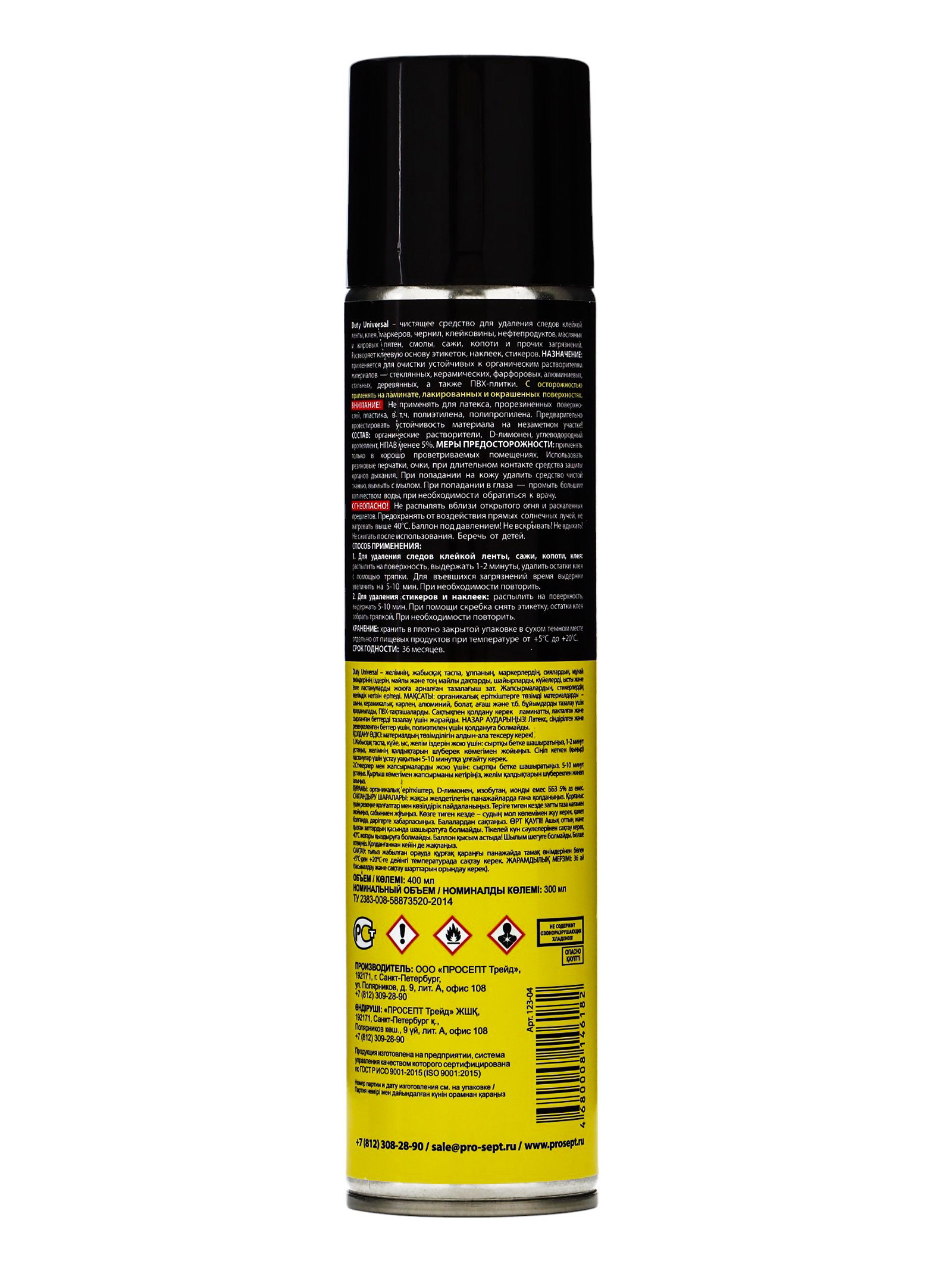 Размер упаковки: 5 x 23.5 x 5 см. tnved: 3402209000 Температурное ограничение: Нет Вес, г/Объём, мл: 400 Форма выпуска: Аэрозоль Запрет реализации по сегментам: 00000000208 Удалитель клейкой ленты, клея, наклеек чистящее средство для удаления следов клейкой ленты, клея, маркеров, чернил, клейковины, нефтепродуктов, масляных и жировых пятен, смолы, сажи, копоти и прочих загрязнений. Растворяет клеевую основу этикеток, наклеек, стикеров. Подходит для обработки стеклянных, металлических, деревянных, керамических и ПВХ поверхностей. Преимущества: • удаляет следы клейкой ленты, стикеров и т.д.; • удобное нанесение состава; • видимый результат через 5-10 минут; • подходит для покрытия автомобиля. Способ применения: • Протестировать устойчивость материала на незаметном участке. • Для удаления следов клейкой ленты, сажи, копоти, клея: распылить на поверхность, выдержать 1-2 минуты, удалить остатки клея с помощью тряпки. Для въевшихся загрязнений время выдержки увеличить на 5-10 мин. не допуская высыхания средства. • Для удаления стикеров и наклеек: распылить на поверхность, выдержать 5-10 мин. При помощи скребка снять этикетку, остатки клея собрать тряпкой. Меры предосторожности: применять только в хорошо проветриваемых помещениях. Для защиты использовать резиновые перчатки и очки. При попадании на кожу удалить средство чистой тканью, вымыть с мылом. При попадании в глаза промыть большим количеством воды, при необходимости обратиться к врачу. Беречь от детей. | ||
