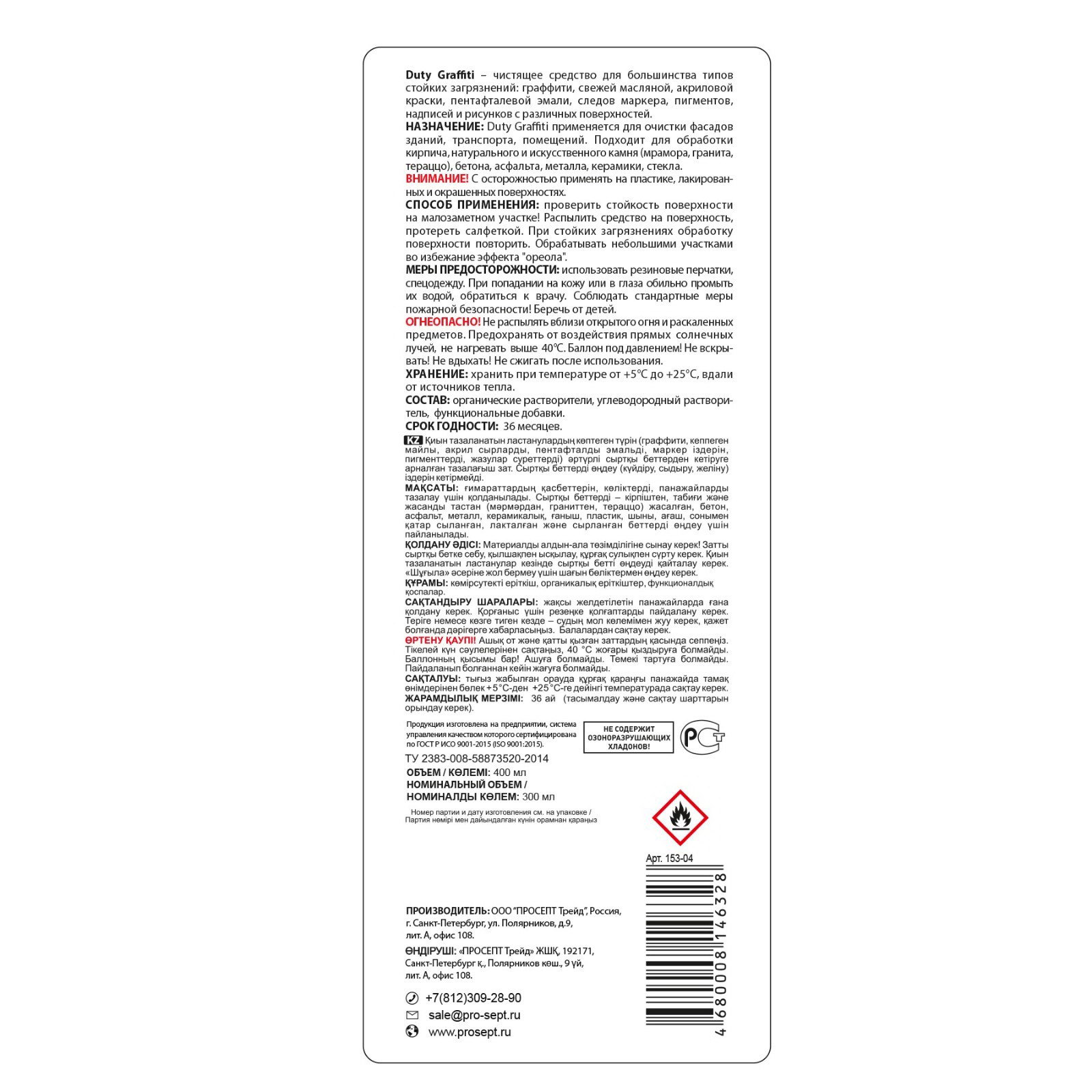 Размер упаковки: 5 x 23.5 x 5 см. Размер упаковки: 5 x 23.5 x 5 см. tnved: 3402209000 Температурное ограничение: Нет Вес, г/Объём, мл: 400 Форма выпуска: Аэрозоль Запрет реализации по сегментам: 00000000208 Средство для удаления граффити, маркера, краски Prosept – средство-удалитель на основе комплекса растворителей. Очиститель эффективно удаляет большинство типов стойких загрязнений - граффити, свежую масляную, акриловую краску, пентафталевую эмаль, следы маркера, пигменты, надписи и рисунки. Антиграффити можно использовать для очистки большинства типов покрытий. Не удаляет следы травления поверхностей. Преимущества: • результат через 5-10 минут; • удаляет граффити и краски; • подходит для очистки фасадов и транспорта; • состав на основе растворителей. Способ применения: • Проверить стойкость поверхности на незаметном участке. Залить средство в распылительное устройство. Распылить средство на поверхность, протереть салфеткой. При стойких загрязнениях обработку поверхности повторить. Обрабатывать небольшими участками во избежание эффекта "ореола". Состав: углеводородный растворитель, органические растворители, D-лимонен 5-15%, НПАВ менее 5%. Меры предосторожности: использовать резиновые перчатки, защитные очки, респираторы и спецодежду. При попадании на кожу или в глаза обильно промыть их водой, при необходимости обратиться к врачу. Беречь от детей. | ||