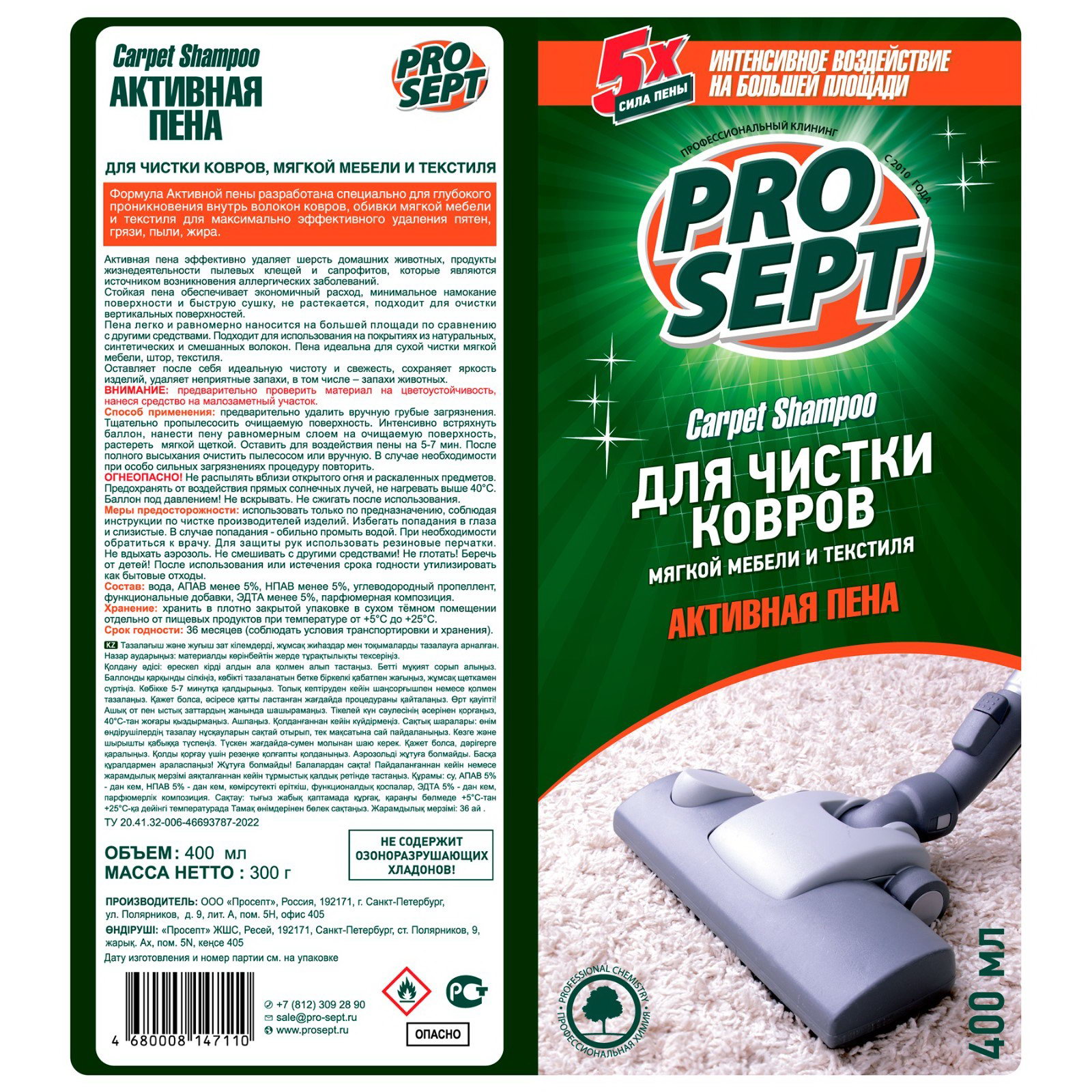Активная пена Carpet Shampoo для чистки ковров, мягкой мебели и текстиля, 400 мл, 5x5x23.5 см., PROSEPT, Россия