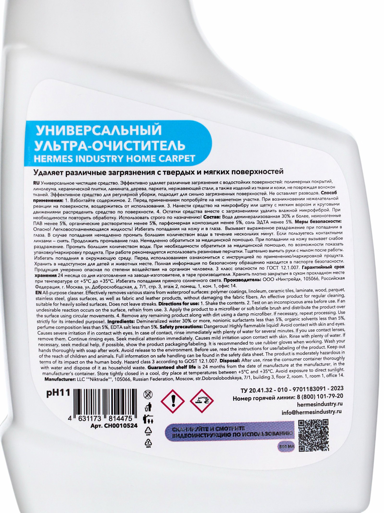 Средство для ковров и мягкой мебели HOME, универсальный ультра-очиститель, 500 мл, Hermes industry, Россия