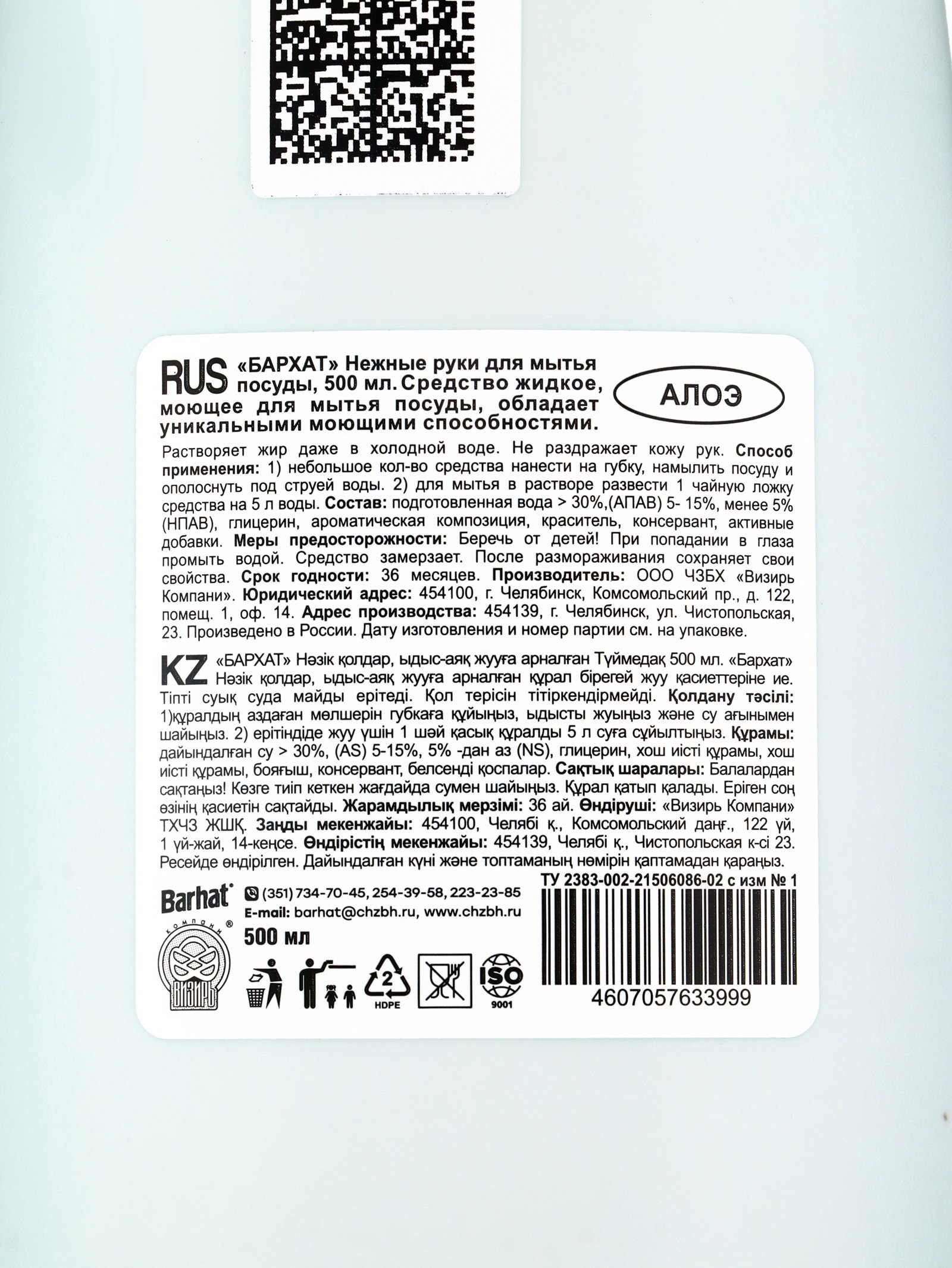Средство для мытья посуды "Бархат Нежные руки", алоэ, гель, 500 мл, 5.5x9x21.5 см., BARHAT, Россия