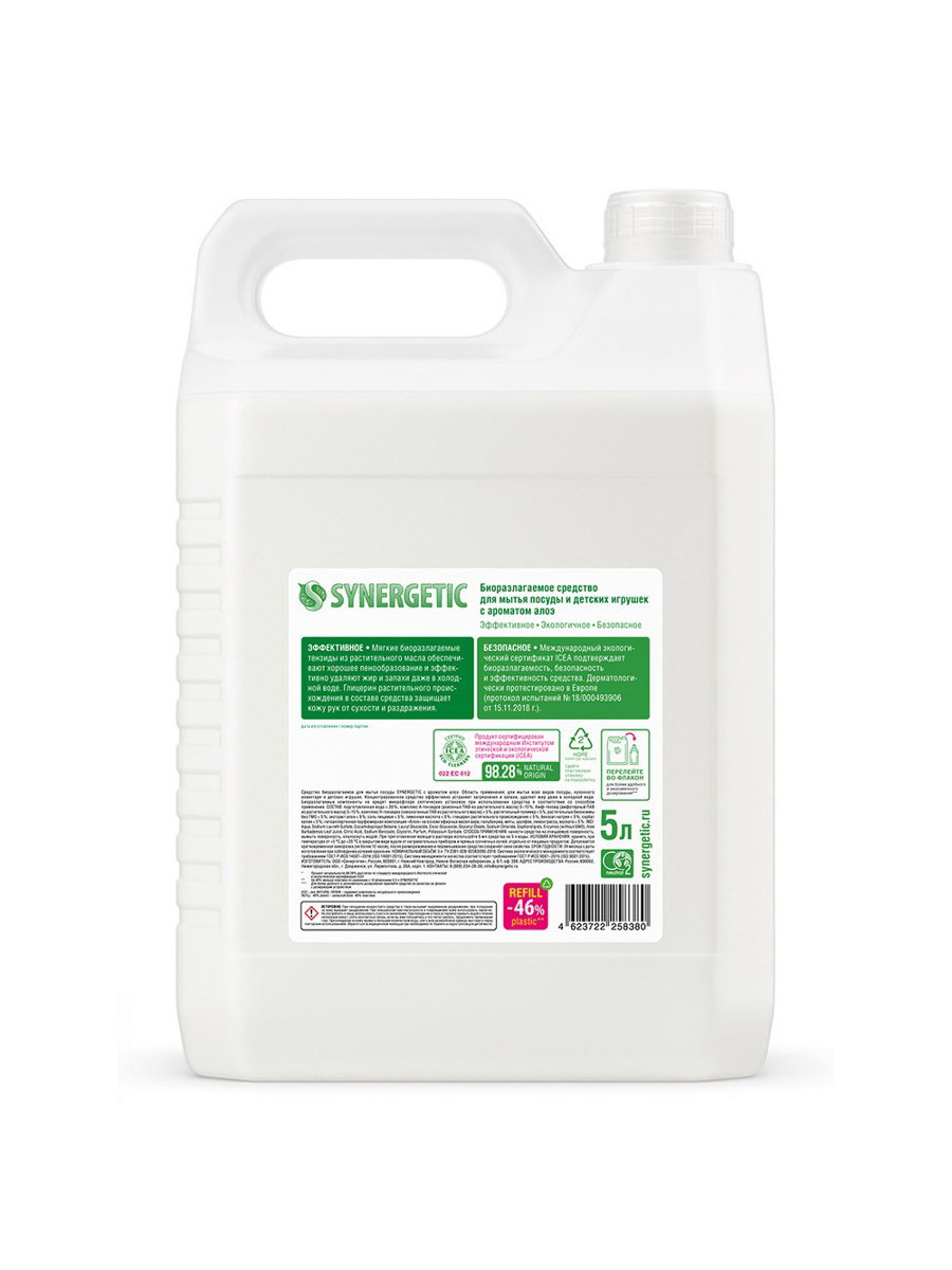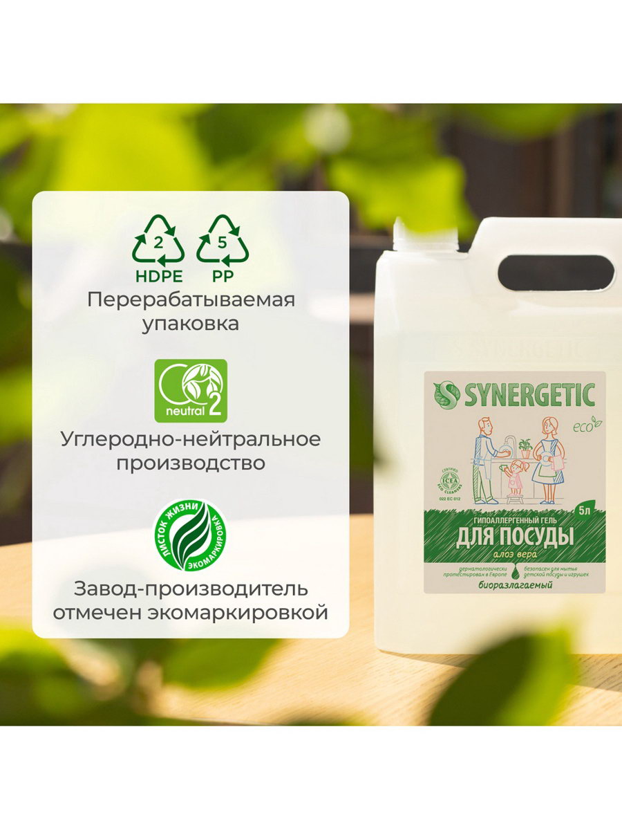 Средство для мытья посуды антибактериальный гель, биоразлагаемый, алоэ вера, 5 л, Synergetic, Россия