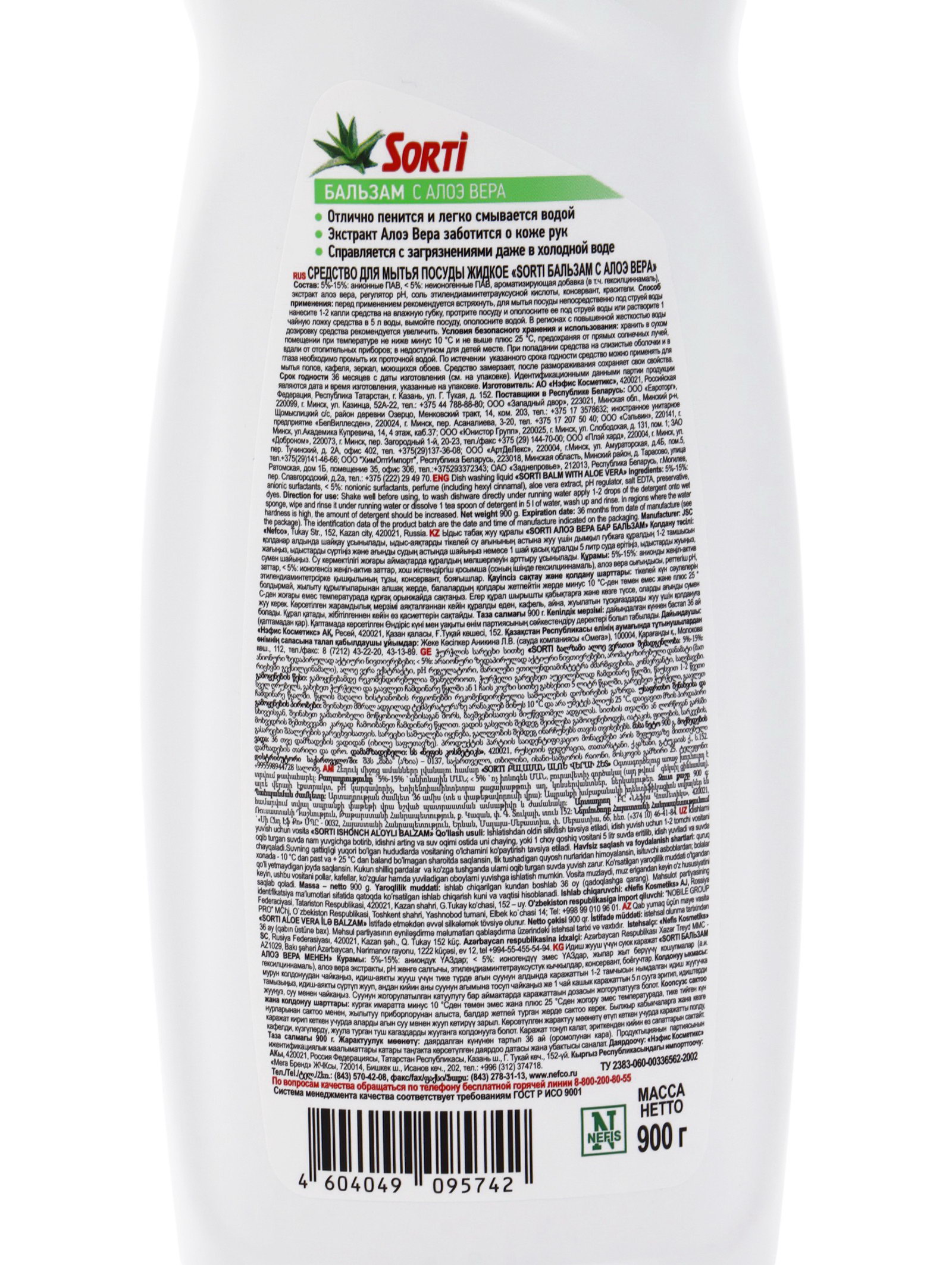 Средство для мытья посуды гель-бальзам с алоэ вера, 900 мл, SORTI, Россия