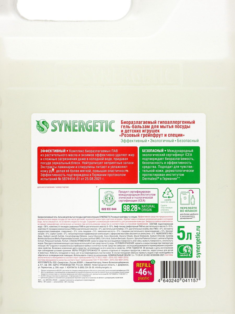 Гель-бальзам для мытья посуды "Розовый грейпфрут и специи", 5 л, Synergetic, Россия