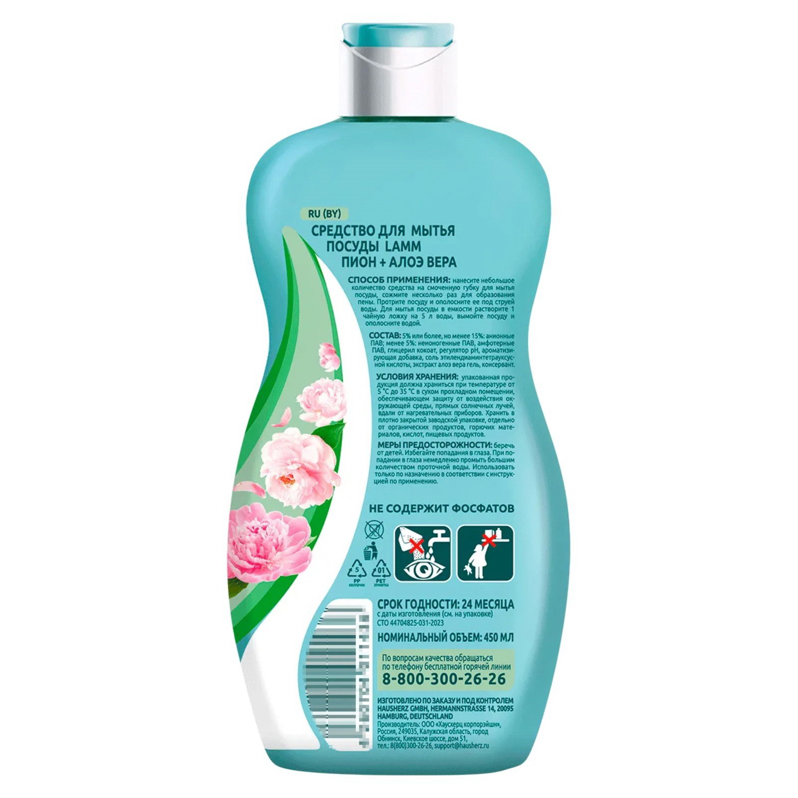 Средство для мытья посуды "Пион и алоэ вера", 450 мл, Lamm, Россия