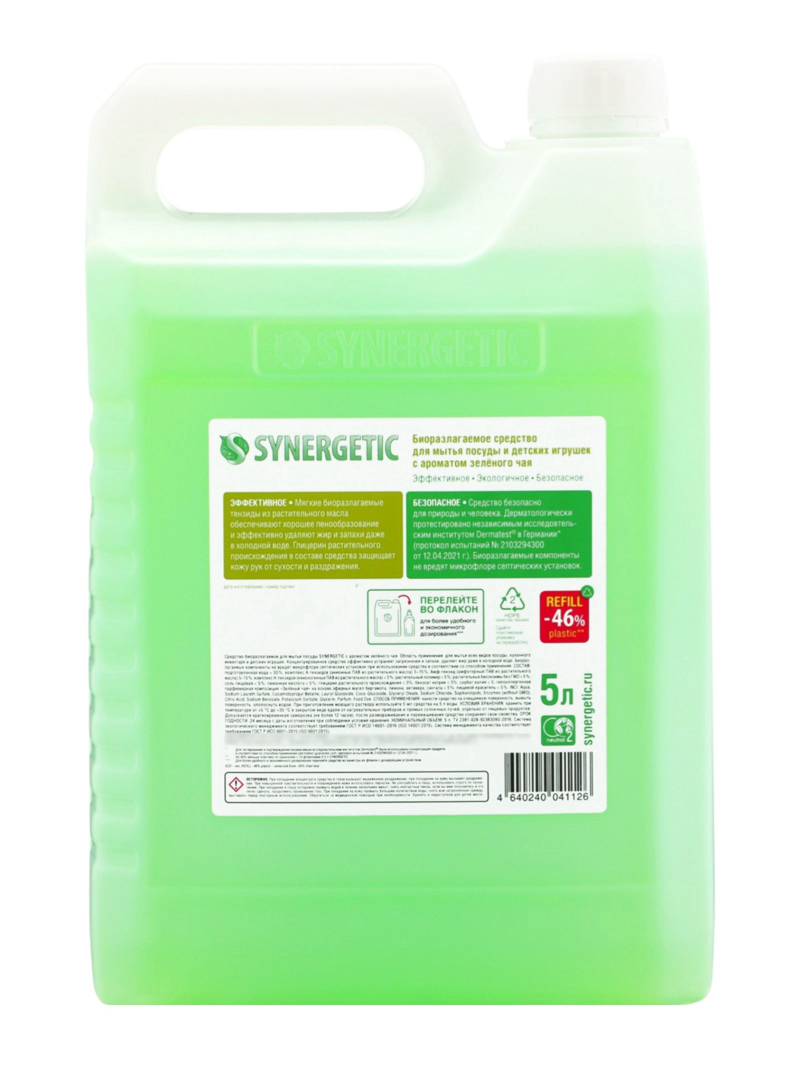 Гель для мытья посуды зеленый чай, 5 л, Synergetic, Россия