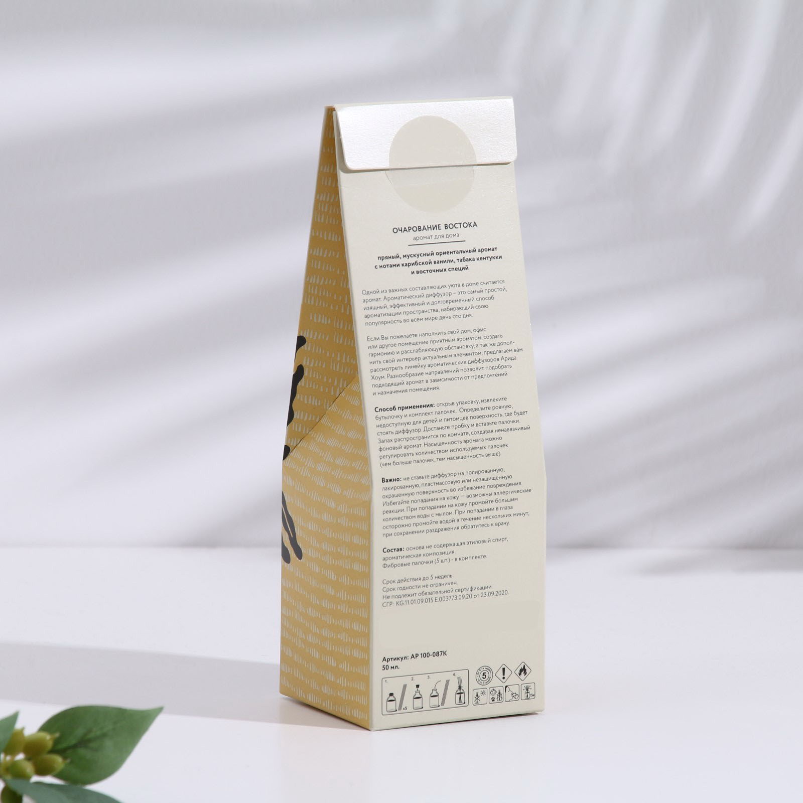 Размер упаковки: 6 x 18.5 x 6 см. Температурное ограничение: Нет Аромат: Восточные специи Вид ароматизатора: Диффузор tnved: 3307490000 | ||