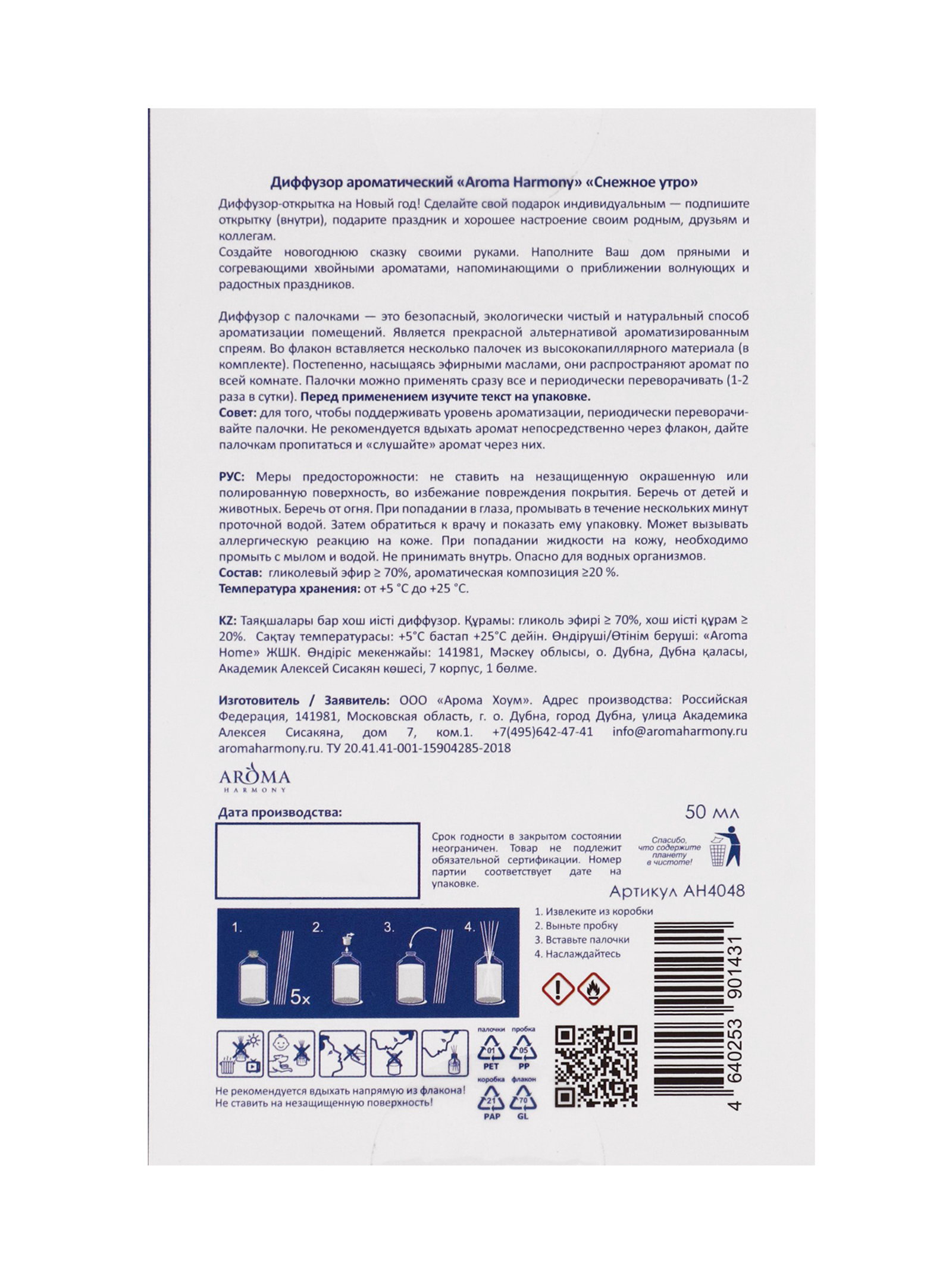Новогодний ароматический диффузор "Снежное утро", с открыткой и палочками, для дома, 50 мл, 50 мл., Aroma Harmony, Россия