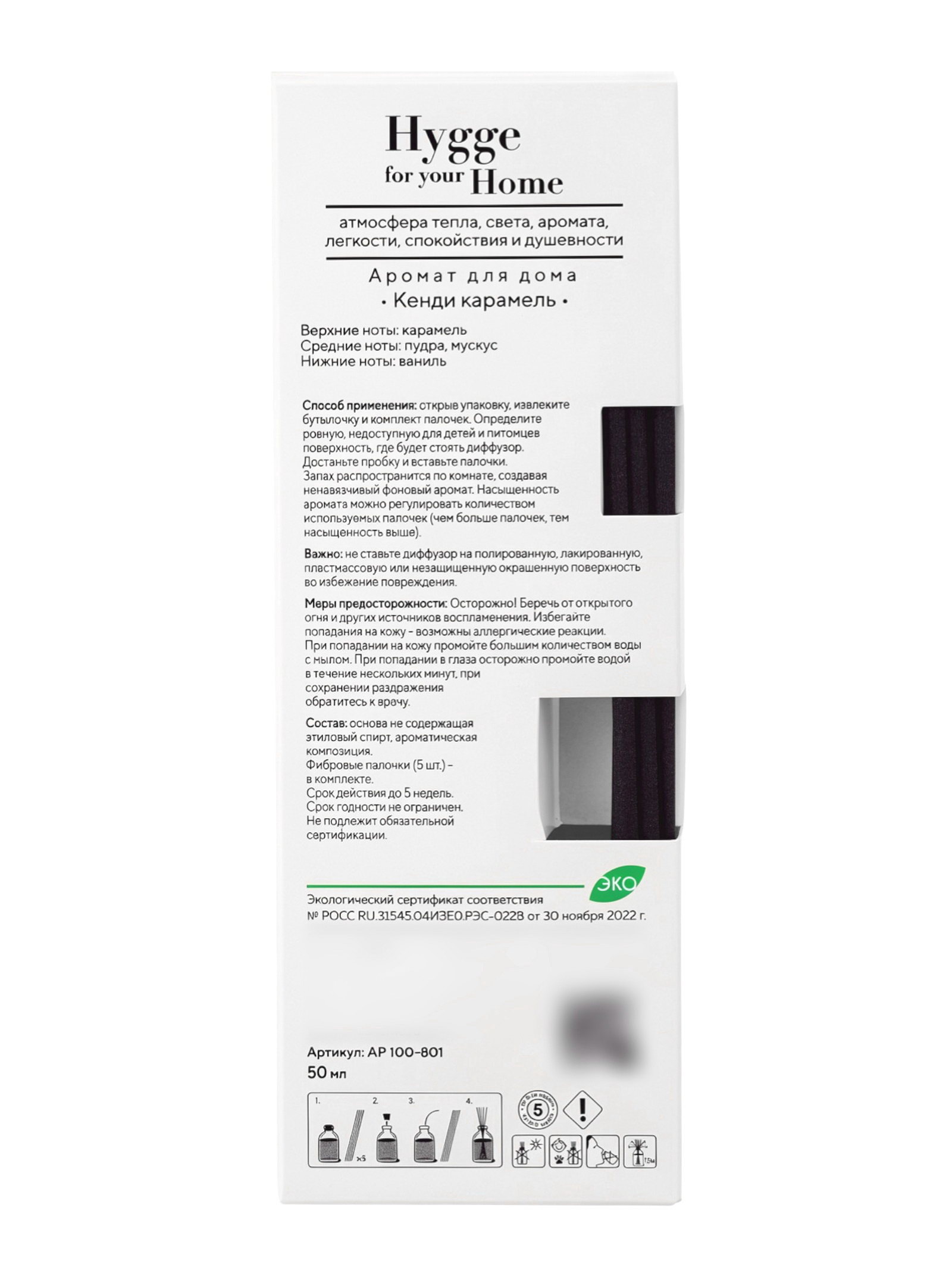 Средние ноты: Мускус, Пудровые аккорды Размер упаковки: 5.5 x 15.5 x 5.5 см. tnved: 3307490000 Температурное ограничение: Нет Базовые ноты: Ваниль Вид ароматизатора: Диффузор Верхние ноты: Карамель Hygge Home "Кенди карамель" это тёплый, сладкий и по-настоящему уютный аромат, который наполняет пространство мягкой гурманской атмосферой. Он идеально подойдёт для создания ощущения комфорта, домашнего тепла и расслабляющего настроения, словно аромат свежего десерта в интерьере. Композиция раскрывается просто и гармонично. В начале звучит насыщенная карамель сладкая, мягкая и аппетитная. В сердце аромата появляются пудровые и мускусные оттенки, которые делают звучание более нежным и бархатистым. Завершается аромат тёплым шлейфом ванили, создающим обволакивающее и уютное послевкусие Этот аромат отлично подойдёт для спальни, гостиной или кухни, создавая атмосферу уюта и сладкого комфорта. Ноты аромата