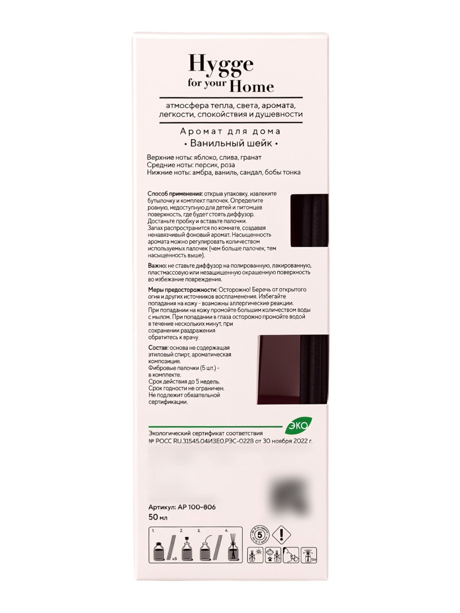 Базовые ноты: Амбра, Бобы тонка, Ваниль, Сандал Верхние ноты: Гранат, Слива, Яблоко Средние ноты: Персик, Роза Размер упаковки: 5.5 x 15.5 x 5.5 см. tnved: 3307490000 Температурное ограничение: Нет Вид ароматизатора: Диффузор Hygge Home "Ванильный шейк" это тёплый, уютный и по-настоящему аппетитный аромат для дома, который наполняет пространство мягкой сладостью и гармонией. Он словно создаёт атмосферу домашнего уюта, где сочетаются фруктовая сочность, цветочная нежность и бархатистая ванильная база. Композиция раскрывается многослойно и мягко. В начале звучат сочные фруктовые ноты яблока, сливы и граната, придающие аромату свежесть и лёгкую сладость. В сердце раскрываются нежные оттенки персика и розы, добавляя композиции утончённость и мягкость. Завершается аромат тёплым, обволакивающим шлейфом амбра, ваниль, сандал и бобы тонка создают насыщенное, сладкое и уютное звучание Этот аромат идеально подойдёт для создания расслабляющей и комфортной атмосферы в гостиной, спальне или зоне отдыха. Ноты аромата