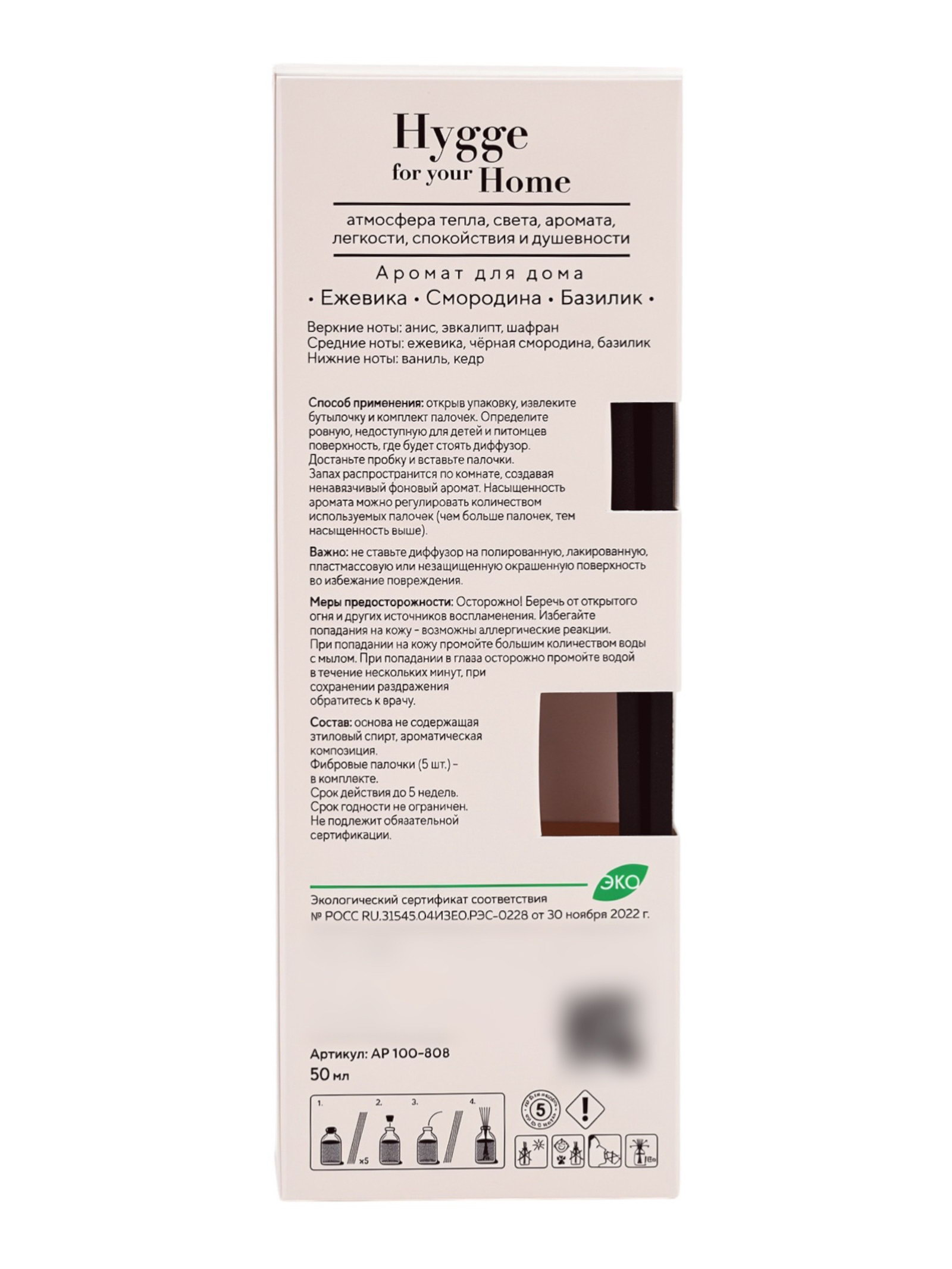 Верхние ноты: Анис, Шафран, Эвкалипт Базовые ноты: Ваниль, Кедр Средние ноты: Базилик, Ежевика, Смородина Размер упаковки: 5.5 x 15.5 x 5.5 см. tnved: 3307490000 Температурное ограничение: Нет Вид ароматизатора: Диффузор Hygge Home "Ежевика / Смородина / Базилик" это стильный и многогранный аромат для дома, который сочетает в себе сочную ягодную сладость, свежесть зелени и мягкую древесную глубину. Он создаёт атмосферу уюта, тепла и лёгкой природной гармонии, идеально дополняя современный интерьер. Композиция раскрывается постепенно и выразительно. В начале звучат необычные и слегка пряные верхние ноты аниса, эвкалипта и шафрана они придают аромату свежесть с лёгким пряным оттенком. В сердце раскрывается яркий ягодный аккорд: сочная ежевика и чёрная смородина переплетаются с зелёной свежестью базилика, создавая насыщенное и живое звучание. Завершается аромат мягким и уютным шлейфом ванили и кедра, который придаёт композиции глубину и завершённость Этот аромат идеально подойдёт для гостиной, кухни или рабочего пространства, наполняя его свежестью, уютом и лёгкой природной энергией. Ноты аромата