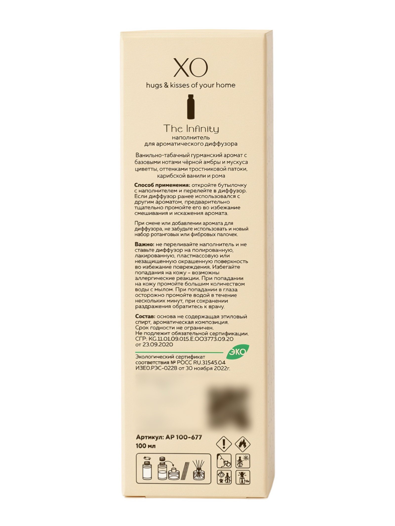 Средние ноты: Ваниль, Ром Базовые ноты: Амбра, Мускус, Табак Размер упаковки: 4 x 13 x 4 см. tnved: 3307490000 Температурное ограничение: Нет Верхние ноты: Тростник XO The Infinity это насыщенный, тёплый и по-настоящему роскошный гурманский аромат, который создаёт в доме атмосферу уюта, глубины и притягательной элегантности. Его композиция напоминает дорогой парфюм с бархатистым шлейфом, который окутывает пространство и оставляет долгое послевкусие. С первых нот аромат раскрывается сладкими и густыми акцентами тростниковой патоки и карибской ванили, создавая ощущение тепла и уюта. Постепенно в композиции проявляются более сложные и чувственные оттенки благородные ноты рома добавляют глубину и характер. В базе звучат насыщенные аккорды чёрной амбры и мускуса циветты, формируя тёплый, обволакивающий и слегка дымный шлейф с табачным оттенком. Этот аромат идеально подойдёт для создания камерной, уютной атмосферы в гостиной, спальне или зоне отдыха, особенно в прохладное время года. Ноты аромата
