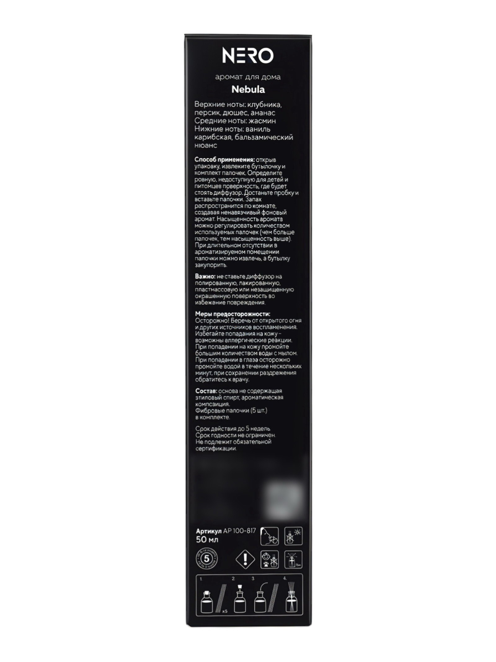 Верхние ноты: Ананас, Груша, Клубника, Персик Базовые ноты: Ваниль, Перуанский бальзам Размер упаковки: 4.5 x 21 x 4.5 см. tnved: 3307490000 Температурное ограничение: Нет Средние ноты: Жасмин Вид ароматизатора: Диффузор Аромат для дома Nero Nebula это насыщенная фруктово-цветочная композиция с тёплым сладким шлейфом. Он наполняет пространство яркими, сочными акцентами и мягкой ванильной глубиной, создавая атмосферу уюта и лёгкой роскоши. Этот аромат идеально подойдёт для тех, кто любит выразительные, сладкие и притягательные композиции, способные преобразить любое помещение и подарить ощущение комфорта. Ароматическая композиция Верхние ноты: клубника, персик, дюшес, ананас Средние ноты: жасмин Нижние ноты: ваниль карибская, бальзамический нюанс Сначала раскрываются сочные фруктовые ноты с яркой сладостью клубники, персика и ананаса, дополненные лёгким оттенком груши. Затем появляется нежный цветочный акцент жасмина, придающий аромату утончённость. В завершении остаётся тёплый и обволакивающий шлейф с нотами ванили и бальзамической мягкости. Особенности Подходит для дома, офиса, спальни и ванной комнаты Создаёт тёплую и уютную атмосферу Обеспечивает равномерное и длительное распространение аромата Стильный внешний вид дополняет интерьер Nero Nebula это гармоничное сочетание сочных фруктов, нежных цветов и тёплой ванильной базы, которое наполняет пространство уютом, сладостью и приятной атмосферой каждый день. | ||