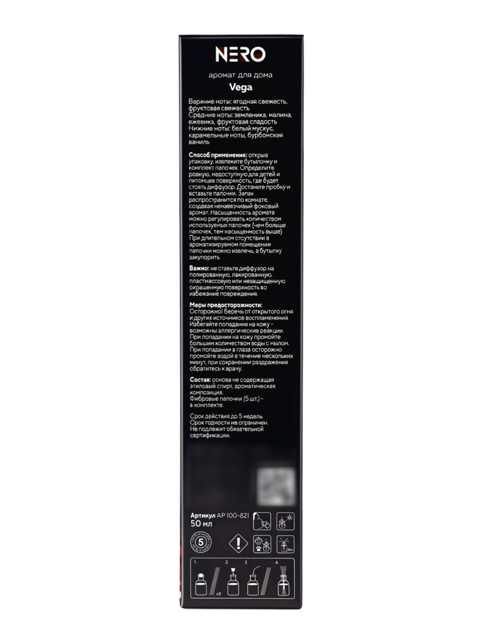 Верхние ноты: Свежий, Фрукты, Ягоды Базовые ноты: Ваниль, Карамель, Мускус Средние ноты: Ежевика, Земляника, Малина, Фрукты Размер упаковки: 4.5 x 21 x 4.5 см. tnved: 3307490000 Температурное ограничение: Нет Аромат: Ягоды Вид ароматизатора: Диффузор Погрузитесь в атмосферу утончённой сладкой свежести с интерьерным ароматом Nero Vega. Этот диффузор создан для тех, кто ценит гармонию фруктовых оттенков и мягкую, обволакивающую базу. Аромат наполняет пространство лёгкостью, уютом и ощущением тепла, превращая дом в место отдыха и вдохновения. Композиция раскрывается постепенно, создавая многослойное звучание: от яркого первого впечатления до глубокого, стойкого шлейфа. Ароматическая композиция Верхние ноты: ягодная свежесть, фруктовая свежесть Средние ноты: земляника, малина, ежевика, фруктовая сладость Нижние ноты: белый мускус, карамельные ноты, бурбонская ваниль Сначала ощущается сочная фруктовая свежесть, затем аромат становится более сладким и ягодным, а в завершении остаётся мягкий, тёплый шлейф с нотами ванили и мускуса. Особенности Подходит для дома, офиса, ванной комнаты и спальни Создаёт уютную, расслабляющую атмосферу Обеспечивает равномерное распространение аромата Элегантный дизайн гармонично вписывается в интерьер Nero Vega это аромат, который наполняет пространство теплом, ягодной нежностью и лёгкой изысканностью, создавая комфортную атмосферу каждый день. | ||