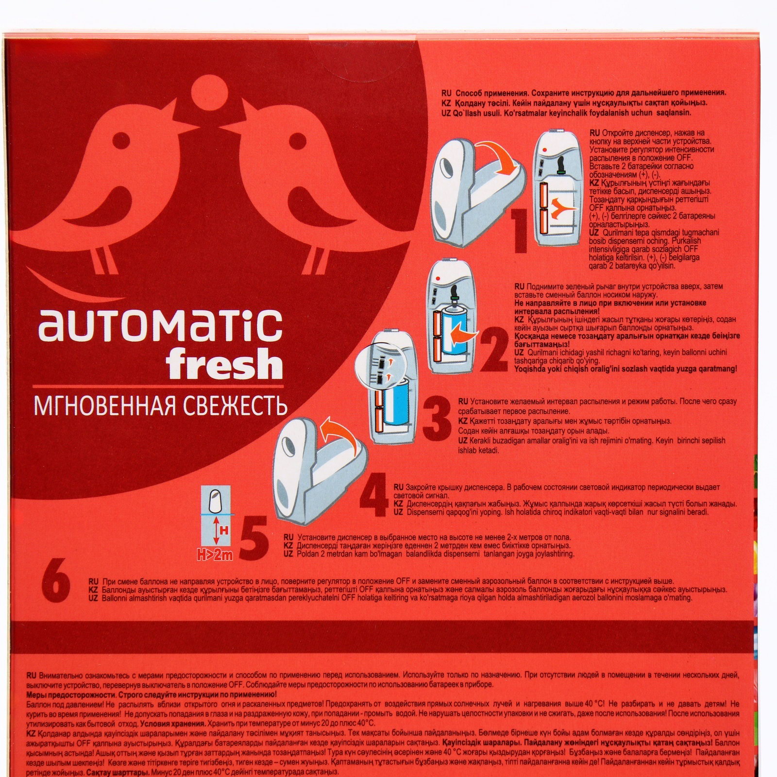 Размер упаковки: 22 x 8.5 x 15 см. tnved: 3307490000 tnved: 3307490000 Температурное ограничение: Нет Принцип работы: Автоматический Аромат: Гранат Вид распыления: Сухое Форма выпуска: Аэрозоль Тип: Диспенсер Запрет реализации по сегментам: 00000000208 Автоматический диспенсер + 2 батарейки. В комплект "До-ре-ми" премиум входит диспенсер и автоматический освежитель воздуха. Комплект освежителя воздуха До-Ре-Ми прекрасно освежит ваш дом от неприятных запахов. Автоматическое распыление без капель и пятен. Свежесть до 60 дней. Способ применения: откройте диспенсер, нажав на кнопку в верхней части устройства. Установите регулятор интенсивности. Вставьте 2 батарейки. Поднимите зеленый рычаг внутри устройства вверх, затем вставьте баллон носиком наружу. Установите желаемый интервал распыления, после чего сработает первое распыление. Закройте крышку диспенсера. Установите диспенсер в выбранное место на высоте не менее 2-х метрах пола. При смене баллона не направляя устройство в лицо, поверните регулятор в положение выкл и замените сменный аэрозольный баллон в соответствии с инструкцией выше. Меры предосторожности: баллон под давлением. Не распылять вблизи открытого огня и раскаленных предметов. Предохранять от воздействия прямых солнечных лучей и нагревания выше 40 °C. Не разбирать и не давать детям. Не курить во время использования. Не допускать попадания в глаза и на раздраженную кожу, при попадании промыть водой. Не нарушать целостности упаковки и не сжигать, даже после использования. | ||