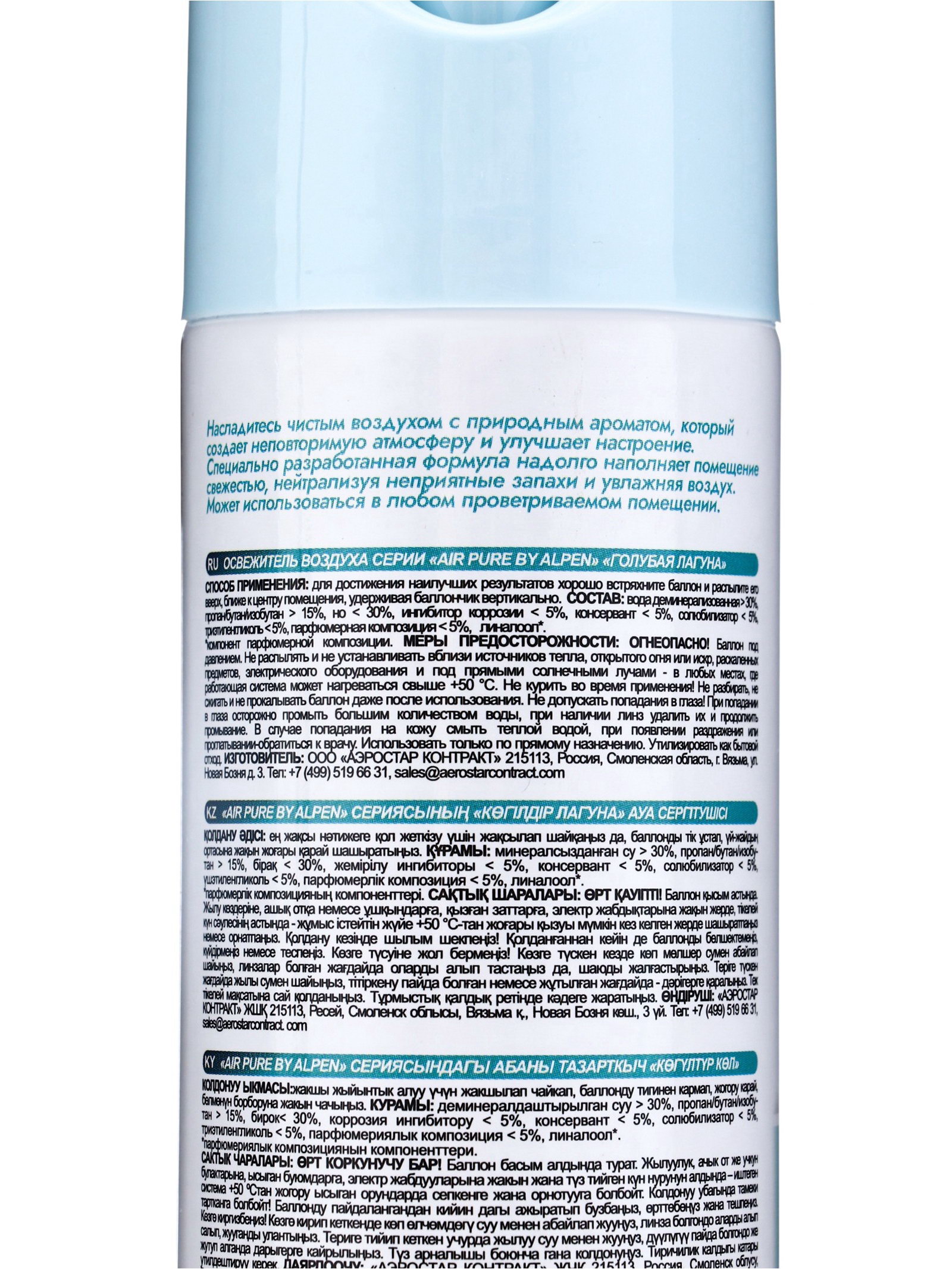 Размер упаковки: 5 x 23.5 x 5 см. tnved: 3307490000 Запрет реализации по сегментам: 00000000208 Температурное ограничение: Нет Тип: Освежитель воздуха Форма выпуска: Аэрозоль Аромат: Голубая лагуна Вид распыления: Влажное Принцип работы: Ручной Освежитель воздуха Air Pure by Alpen "Голубая лагуна" мгновенно обновляет и ароматизирует любое помещение. Свежий и лёгкий морской аромат создаёт ощущение чистоты, прохлады и комфорта. Аэрозольная форма обеспечивает равномерное распыление и быстро устраняет неприятные запахи, поддерживая приятную атмосферу на длительное время. Уже после первого применения воздух наполняется мягким и освежающим ароматом. Эффект от применения: