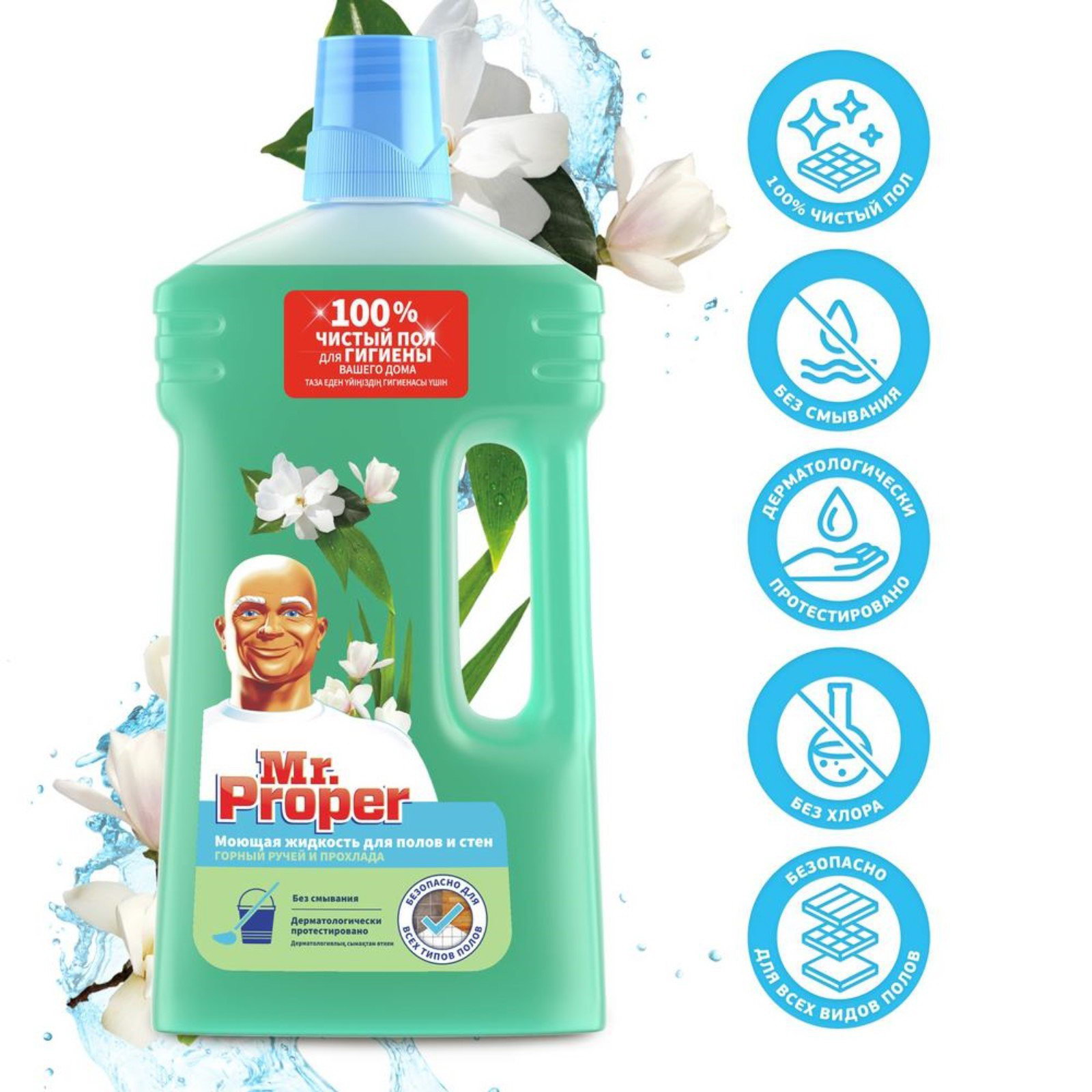 Средство для мытья полов и стен Mr.Proper "Горный ручей и прохлада", 1 л, 12.8x5.4x27.8 см., Mr. Proper, Россия