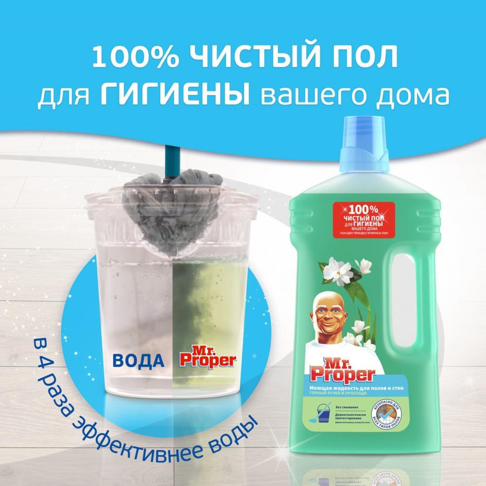 Размер упаковки: 5 x 27.5 x 12 см. tnved: 3402209000 Ароматизированные: Да Содержание хлора: Нет Особенности: Не требует смывания Запрет реализации по сегментам: 00000000208 Mr. Proper "Горный ручей и прохлада" это универсальное средство для уборки, которое обеспечивает эффективное очищение различных поверхностей и наполняет дом ощущением свежего горного воздуха. Формула разработана для быстрого удаления загрязнений без лишних усилий, делая ежедневную уборку простой и комфортной. Средство подходит для мытья полов, стен, плитки, кухонных и ванных поверхностей. Оно эффективно удаляет пыль, следы обуви, жир и другие бытовые загрязнения, не повреждая покрытие. Подходит для большинства водостойких материалов, включая линолеум, ламинат, паркет и пластик. Благодаря специальной формуле средство не оставляет разводов и липкости, а в большинстве случаев не требует смывания. Это позволяет существенно сократить время уборки. После использования в помещении остаётся приятный, лёгкий аромат "Горный ручей и прохлада", создающий ощущение чистоты и свежести. Преимущества: