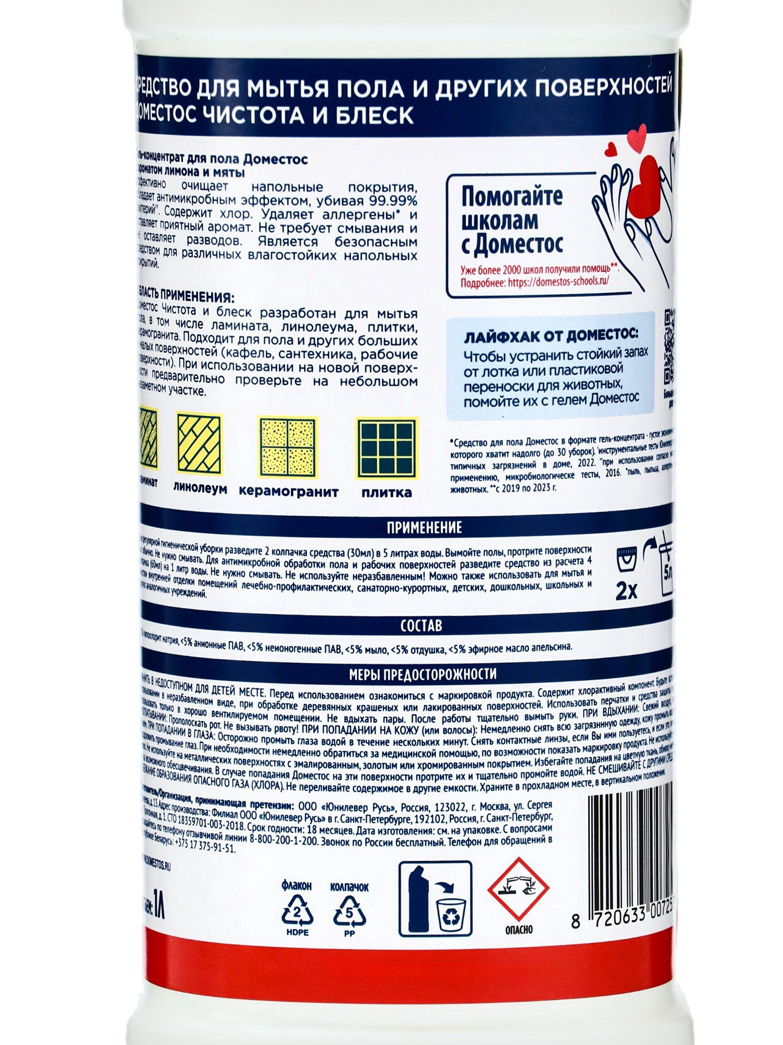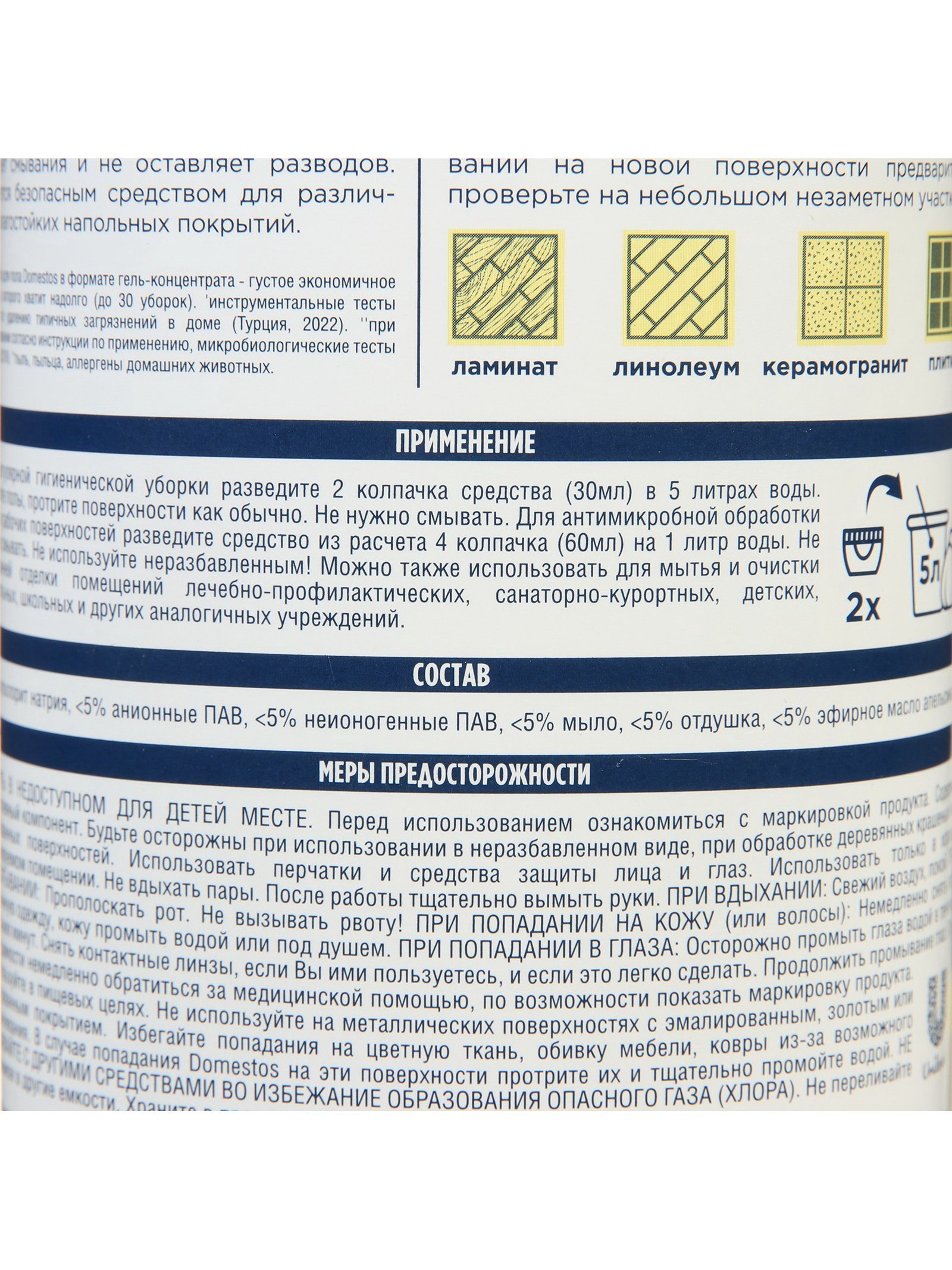 Аромат: Лимон, Мята Вид покрытия: Ламинат, Линолеум Размер упаковки: 6 x 31 x 9 см. tnved: 3402310000 Вес, г/Объём, мл: 1000 Температурное ограничение: Нет Особенности: Дезинфицирующее Содержание хлора: Да Ароматизированные: Да Запрет реализации по сегментам: 00000000208 Средство для мытья полов Domestos "Лимон и мята" возвращает чистоту и блеск, устраняет аллергены, оказывает антимикробное действие. Уничтожает до 99,99% болезнетворных бактерий'. Легкий аромат цитруса и мяты сохраняются еще долгое время. Средство для мытья полов Domestos "Лимон и мята": - обеспечивает 100% чистоту; - не оставляет разводов, не требует смывания; - убивает 99,99% всех известных бактерий'; - оставляет приятный аромат. Подходит для большинства напольных покрытий, в том числе ламината, плитки и линолеума. Безопасно для кафеля, сантехники и рабочей зоны на кухне. Перед тем, как приступить к уборке, ознакомьтесь с инструкцией и проверьте действие вещества на незаметном участке. Способ применения: для обычной уборки разведите 30 мл моющего средства (2 колпачка) в 5 л чистой воды. Полученным раствором обработайте загрязненные поверхности, не смывая. При антимикробной обработке разведите 60 мл средства (4 колпачка) в 1 л воды. После уборки раствор не смывать. Состав: <5% гипохлорит натрия, <5% анионные ПАВ, <5% неионогенные ПАВ, <5% мыло, <5% отдушка, <5% эфирное масло апельсина. Объем: 1 л | ||