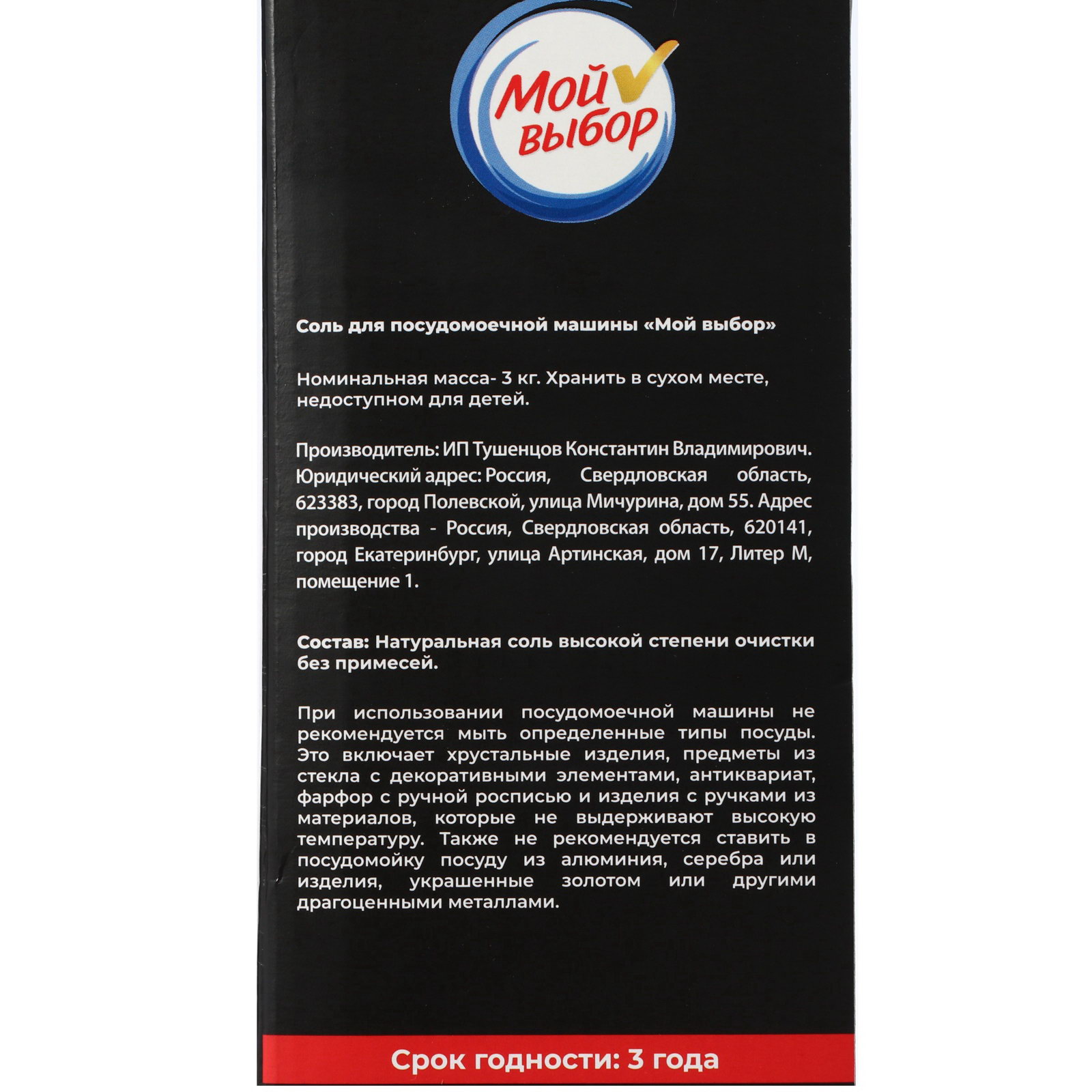 Соль для посудомоечной машины "Мой Выбор", 3 кг, Мой выбор, Россия