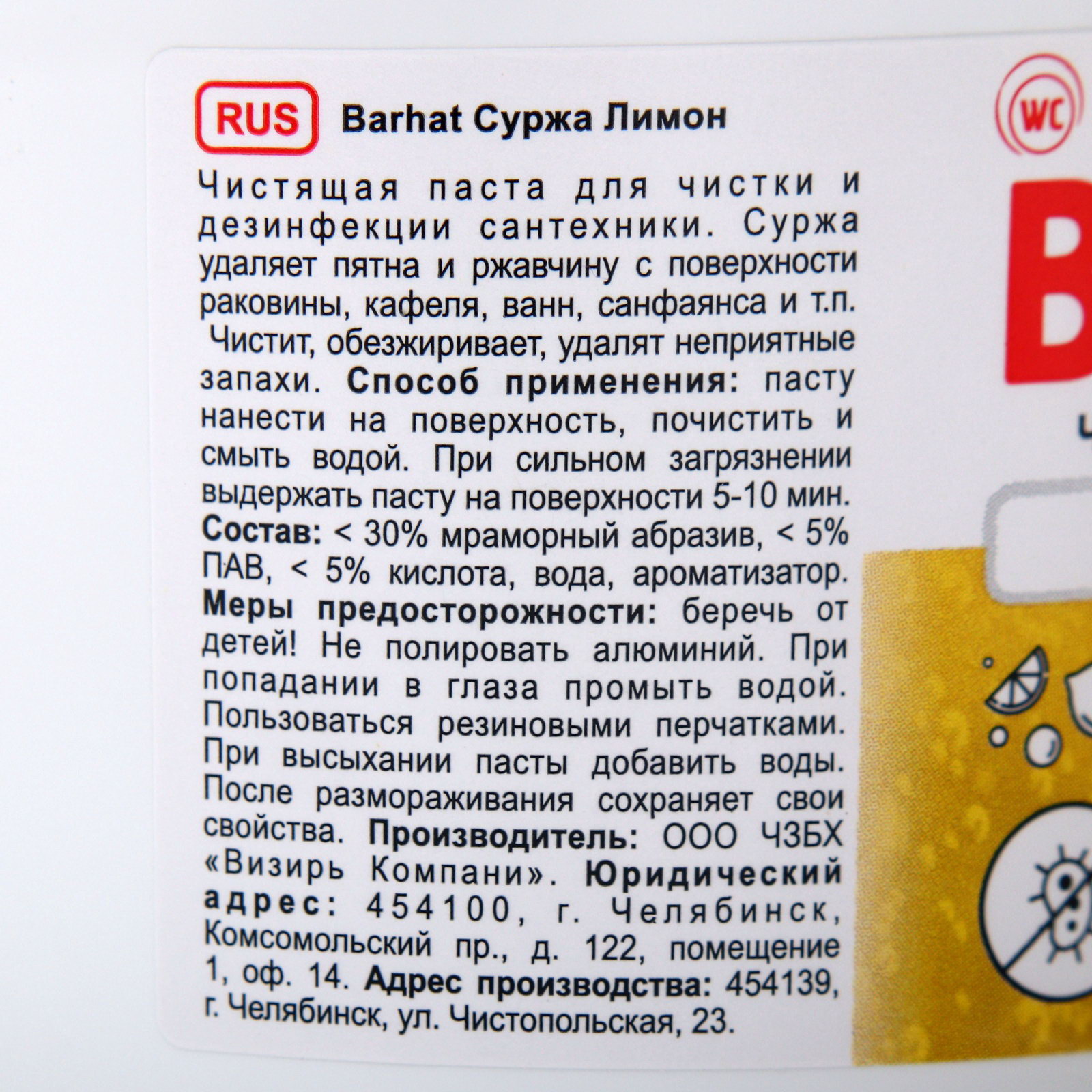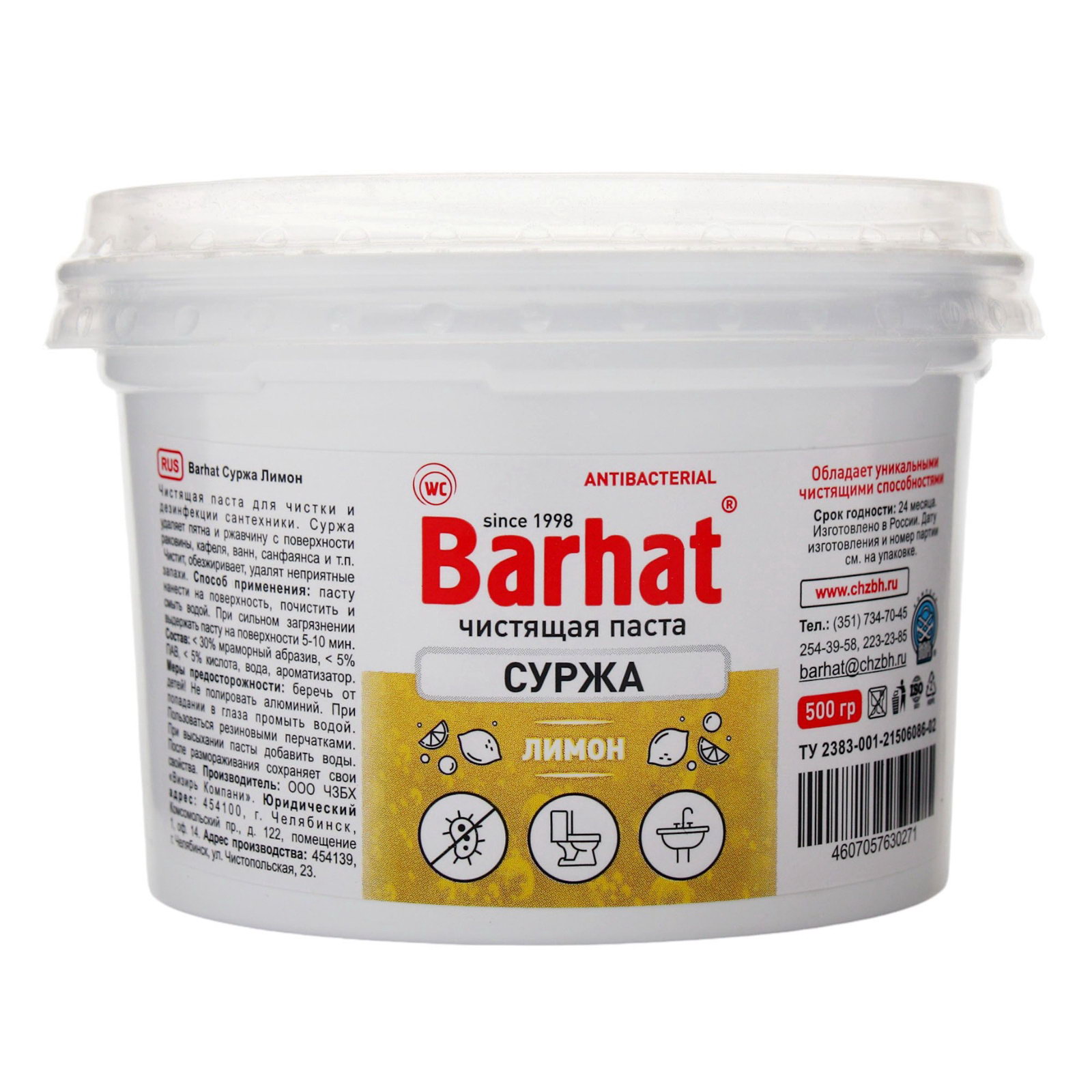 Чистящая паста для чистки СУРЖА, "Лимон", 500 г, 7x9x9 см., ULTRA BARHAT, Россия