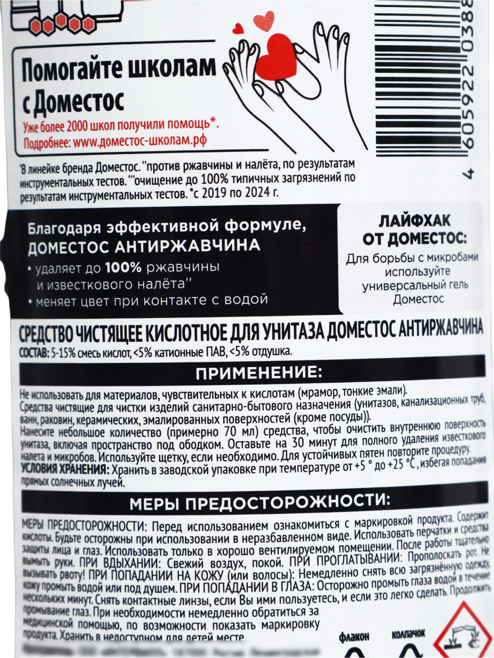 Меры предосторожности:Избегать попадания в глаза и на кожу. При попадании немедленно промыть большим количеством воды. Не смешивать с другими чистящими средствами. Использовать в хорошо проветриваемом помещении. Хранить в недоступном для детей месте. Средство Domestos "Антиржавчина" это надёжное решение для борьбы с самыми сложными загрязнениями и поддержания идеальной чистоты в ванной комнате. | ||