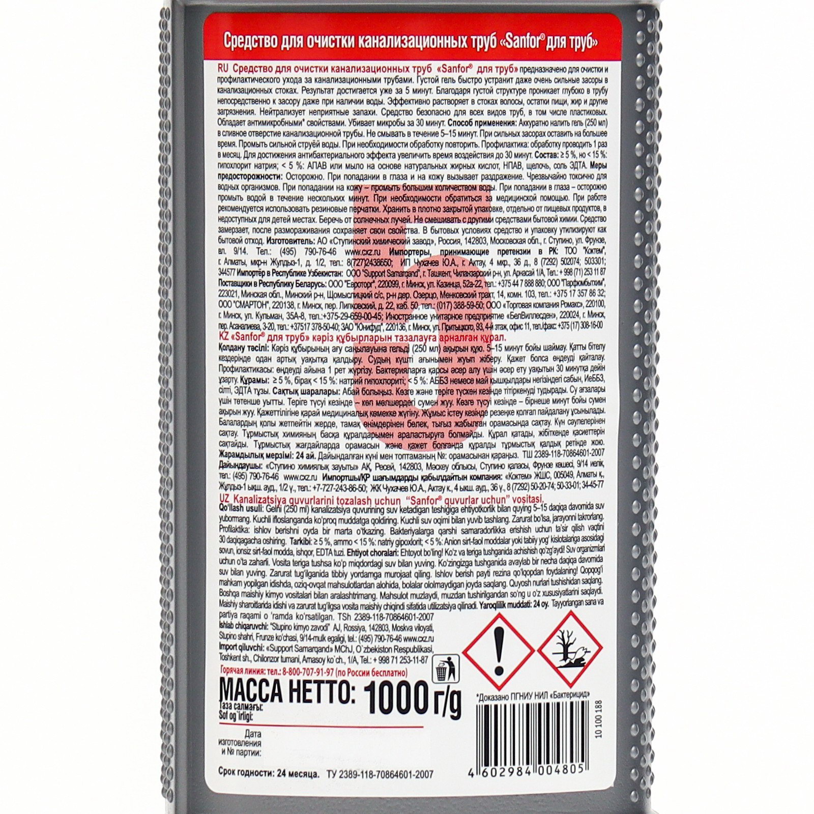 Средство для прочистки канализационных труб, 1000 мл, Sanfor, Россия